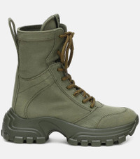 These military-inspired ankle boots from Miu Miu are made from green canvas with olive-green laces for a tonal touch. The sturdy style has been crafted in Italy and comes set upon chunky rubber soles with plenty of grip. Team yours with a minidress from the brand to channel a rebel-chic aesthetic. Product Details - Sole: leather insole, rubber sole - Upper: fabric - Toe shape: round toe - Color: green - Closure: lace-up - Lining: fabric - Designer color name: Militare - Made in Italy - Item number: P00436115 Size & Fit - Fits slightly large to size - we recommend trying a half size smaller - European sizes - 3,5cm-1.5" platform (size EU 38) - 5,5cm-2" wedge heel (size EU 38)