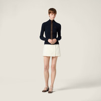 A refined ribbed knit defines the slim fit of this cashmere cardigan in which the leather trim on the collar, logo and zipper discreetly embody Miu Miu's artisan craftsmanship and contemporary aesthetics. - Product code: MMF992_1747_F0008_S_OOO - Ribbed knit - Regular fit - Long sleeves - Front zipper closure - Semi-raglan shoulder - Leather-edged zipper - Embroidered lettering logo - Imported - The model is 178 cm tall and wears a size 38 Height 55cm Materials Main material: 100% Cashmere