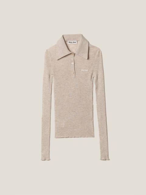 A casual yet refined style characterizes this cashmere and silk knit polo shirt. The slim fit and ribbed knit create a silhouette with effortless femininity, while the intarsia logo in a contrasting color completes the look with an iconic note. - Product code: MML820_13KV_F0008_S_232 - Ribbed knit - Slim fit - Semi-raglan shoulder - Front button closure - Long sleeves - Intarsia logo - Imported - The model is 180 cm tall and wears a size 38 Height 60cm Materials Main material: 30% Silk 70% Cashmere
