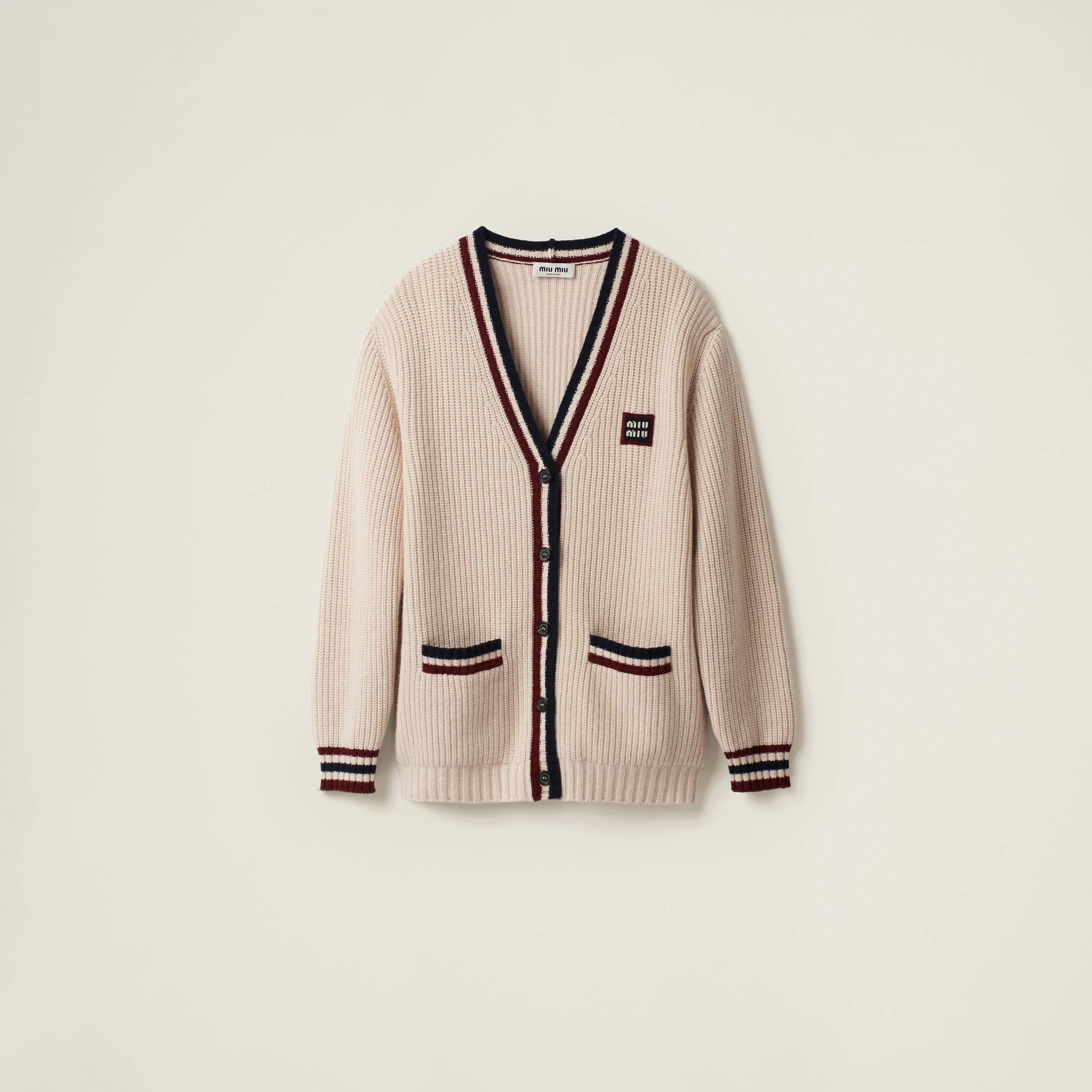 A college style inspires this cashmere knit cardigan. Horizontal stripe trim on the sleeve hem, pocket, and along the neckline and front closure chromatically echoes the logo patch that adds an iconic note to the garment. - Product code: MMF840_138R_F0018_S_OOO - Long sleeve - Fisherman's rib knit - Oversized fit - V-neck - Semi-raglan shoulder - Ribbed knit cuffs and hem - Knit logo patch - Front button closure - Flap pockets - Height: 70cm - Imported