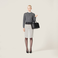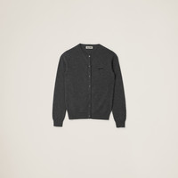 The Miu Miu logo enhances the sleek lines and versatile design of this cashmere knit cardigan with a refined chromatic contrast and its iconic character. - Product code: MMF787_13S1_F0480_S_232 - Long sleeve - Plain knit - Slim fit - Ribbed knit crew neck - Semi-raglan shoulder - Ribbed knit cuffs and hem - Intarsia logo - Front button closure - Imported - The model is 178 cm tall and wears a size 38 Height 58cm Materials Main material: 100% Cashmere