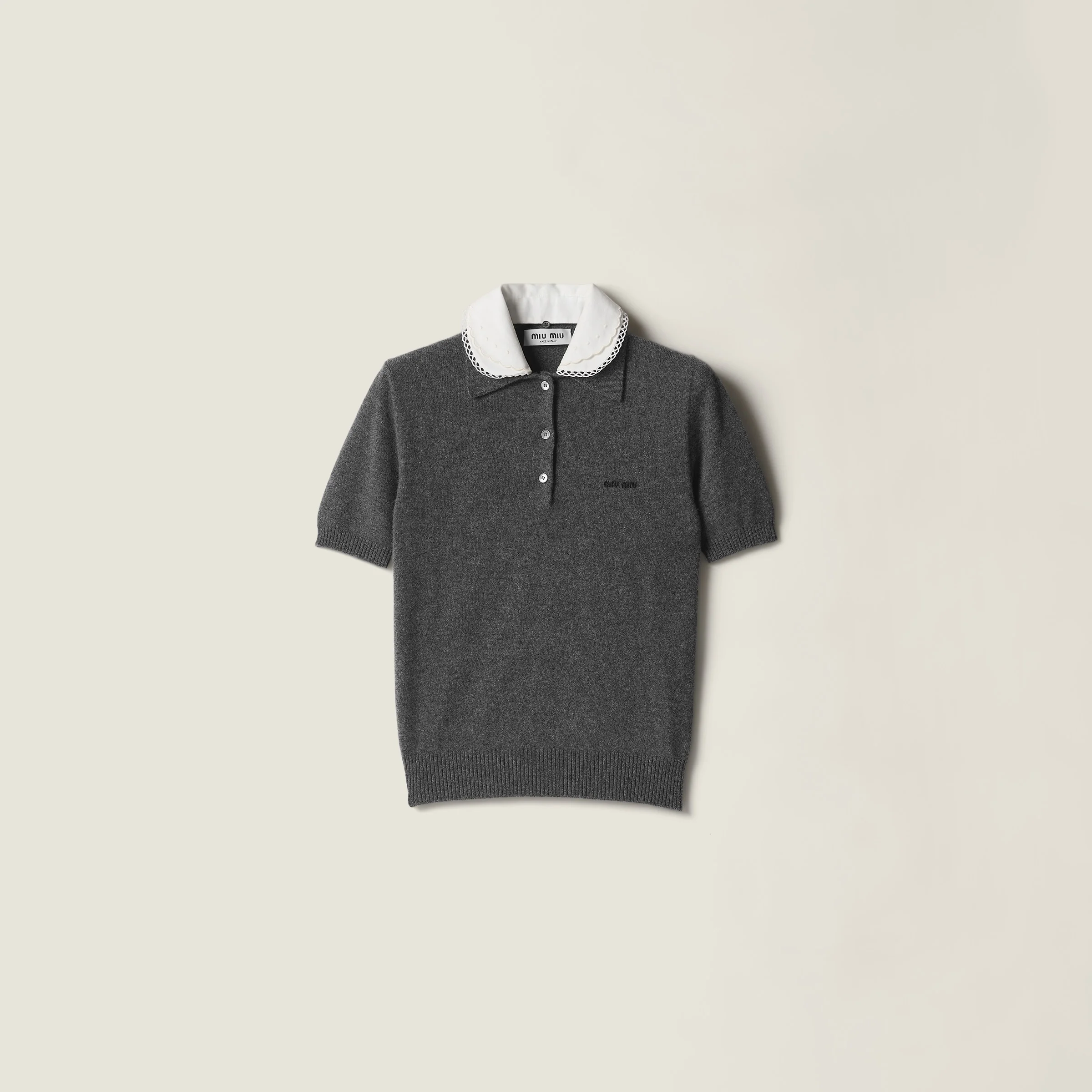 The essential cashmere polo takes on a versatile identity, defined by a distinctive detachable poplin collar with elegant, runway-inspired embroidery, adding character to everyday looks and refined layered styling. - Product code: MML03Z_17JF_F0480_S_OOO - Plain knit - Regular fit - Short sleeves - Detachable poplin collar - Front button closure - Semi-raglan shoulder - Ribbed cuffs and hem - Intarsia logo - Imported Height 56cm Materials Main material: 100% Cashmere