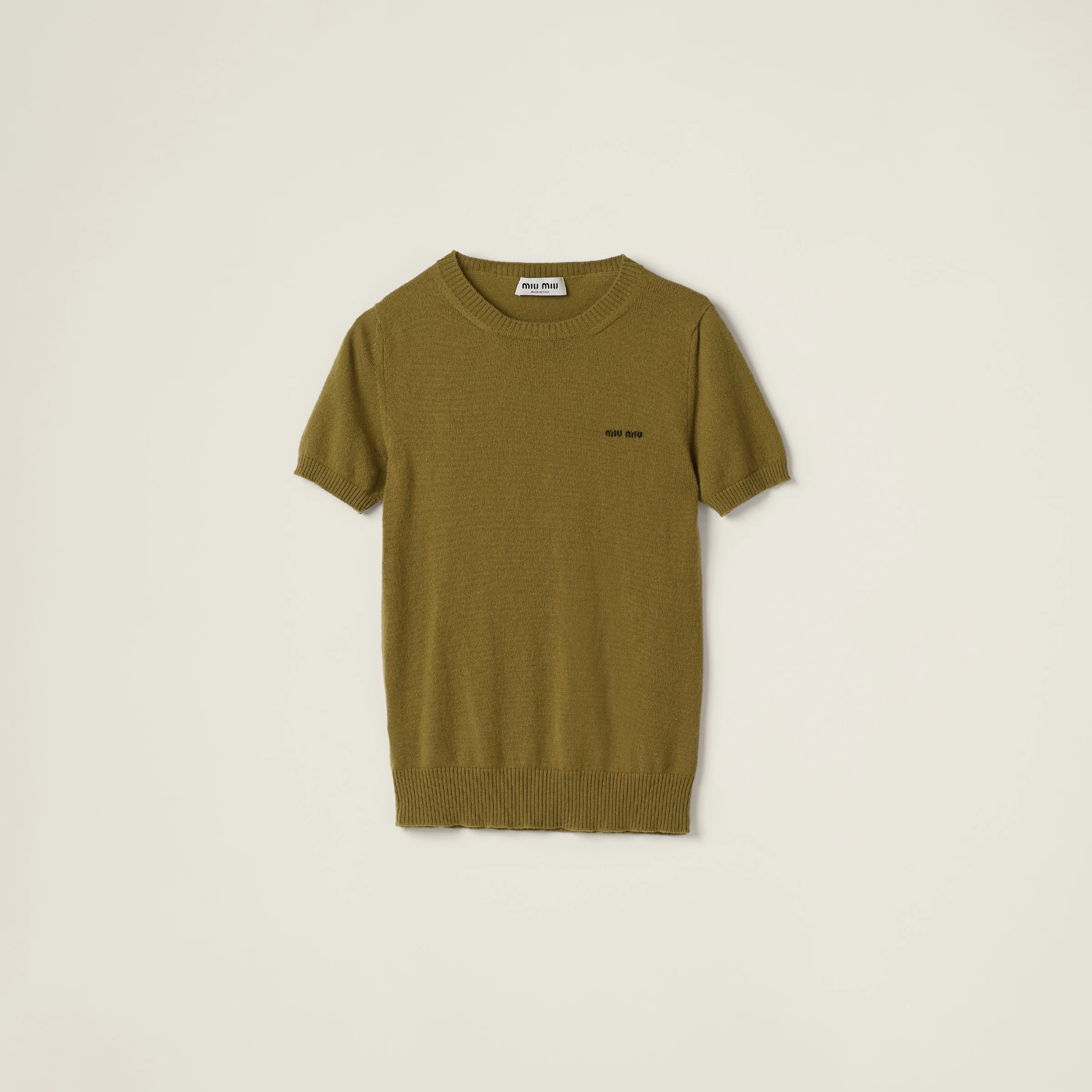The Miu Miu logo gives this cashmere sweater a distinctive personality. The sleek lines make the garment versatile while the crew-neck in a contrasting color completes the look with a refined touch. - Product code: MML842_13S1_F0613_S_232 - Short sleeves - Plain knit - Slim fit - Ribbed knit crew neck - Regular shoulder - Ribbed knit sleeve trim and hem - Intarsia logo - Imported - The model is 178 cm tall and wears a size 38 Height 58cm Materials Main material: 100% Cashmere