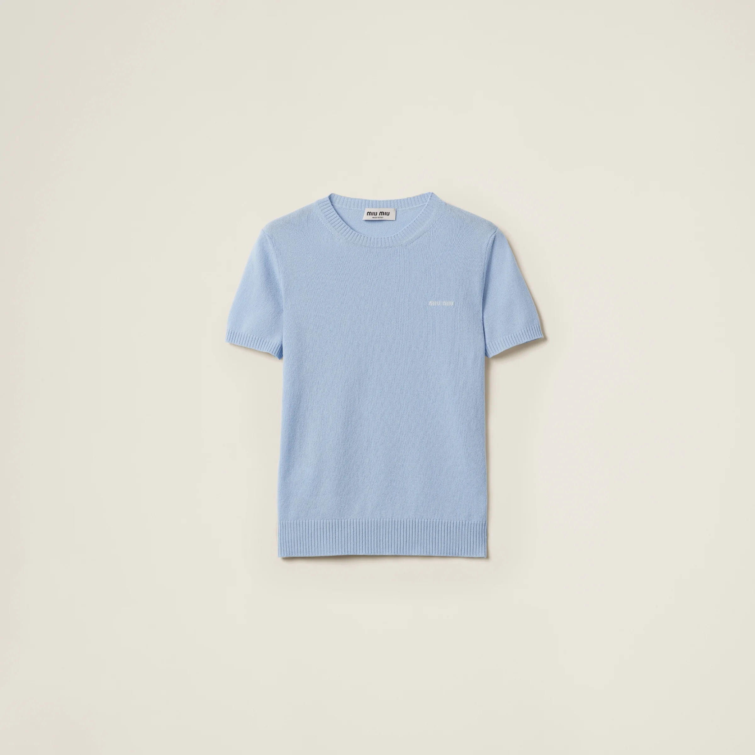 The Miu Miu logo gives this cashmere sweater a distinctive personality. The sleek lines make the garment versatile while the crew-neck in a contrasting color completes the look with a refined touch. - Product code: MML842_13S1_F0012_S_232 - Short sleeves - Plain knit - Slim fit - Ribbed knit crew neck - Regular shoulder - Ribbed knit sleeve trim and hem - Intarsia logo - Imported - The model is 176 cm tall and wears a size 38 Height 58cm Materials Main material: 100% Cashmere