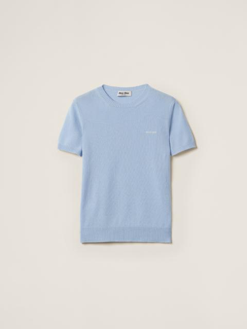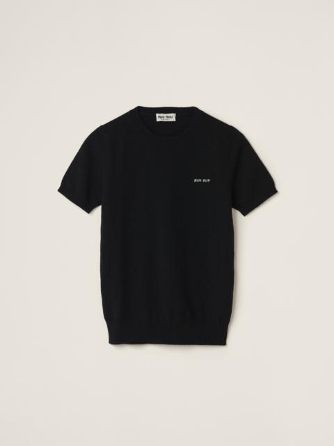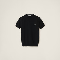 The Miu Miu logo gives this cashmere sweater a distinctive personality. The sleek lines make the garment versatile while the crew-neck in a contrasting color completes the look with a refined touch. - Product code: MML842_13S1_F0002_S_232 - Short sleeves - Plain knit - Slim fit - Ribbed knit crew neck - Regular shoulder - Ribbed knit sleeve trim and hem - Intarsia logo - Imported Height 58cm Materials Main material: 100% Cashmere