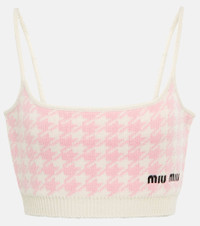 Opt for this crop top from Miu Miu for a playful layering piece with retro flair. Made from pure cashmere, the style features a pink and white jacquard-knit houndstooth motif and is accented with logo embroidery. Product Details - Material: 100% cashmere - Care instructions: dry clean - Made in Italy - Designer color name: Bianco Rosa - Item number: P00710305 Size & Fit - True to size - Straight fit - Cropped - The model seen in the picture is 178cm-5'10" and wearing a size IT 40