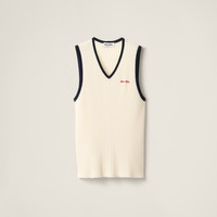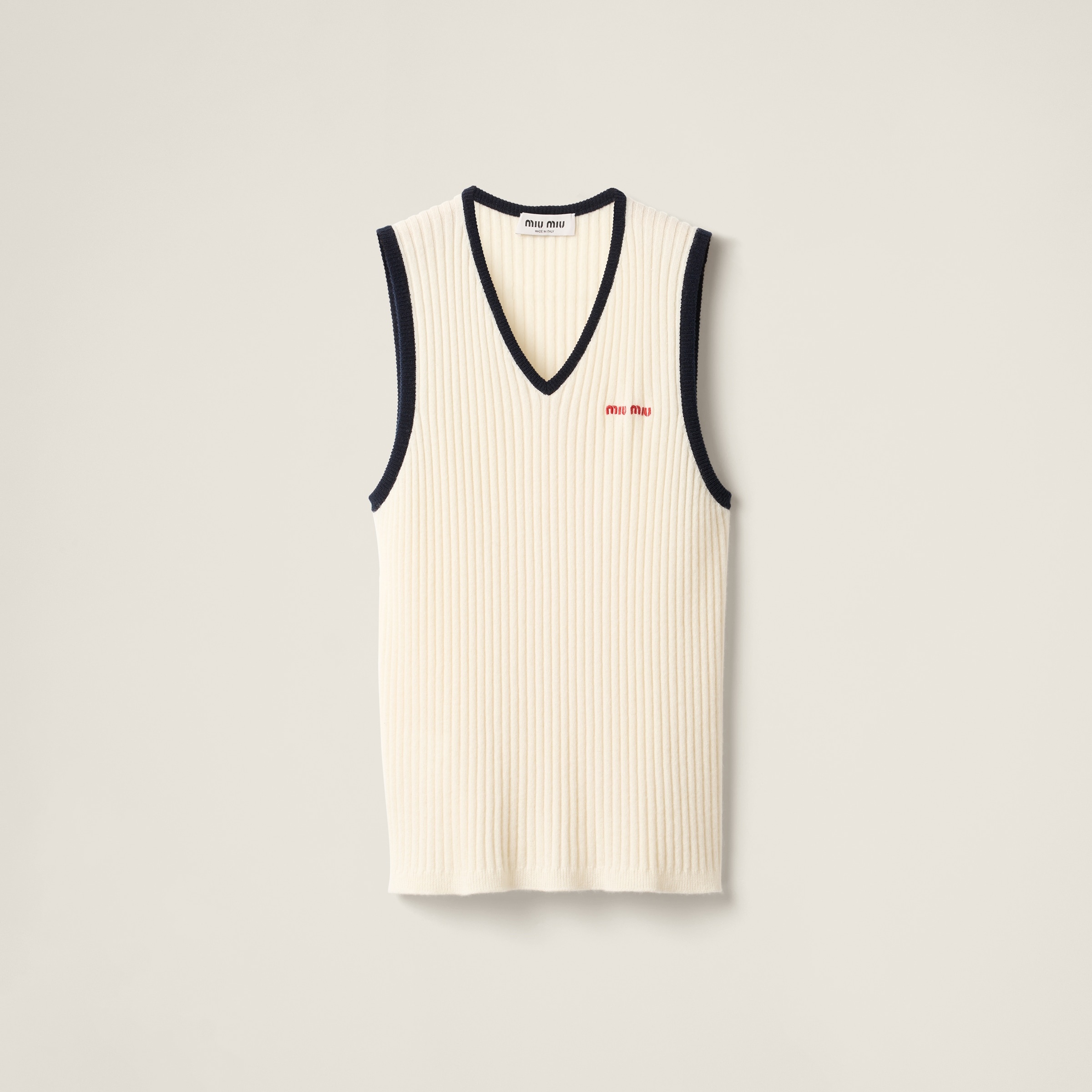 The tennis inspiration blends with preppy elements in this cashmere vest. The essential lines are enriched with ribbed motif and contrasting colors in a classic garment with a versatile, contemporary touch. - Product code: MMV254_1580_F075R_S_OOO - Sleeveless - Ribbed motif - Straight fit - Ribbed knit neck - Semi-raglan shoulder - Ribbed hem - Embroidered logo - Imported - The model is 178 cm tall and wears a size 38 Height 65cm Materials Main material: 100% Cashmere
