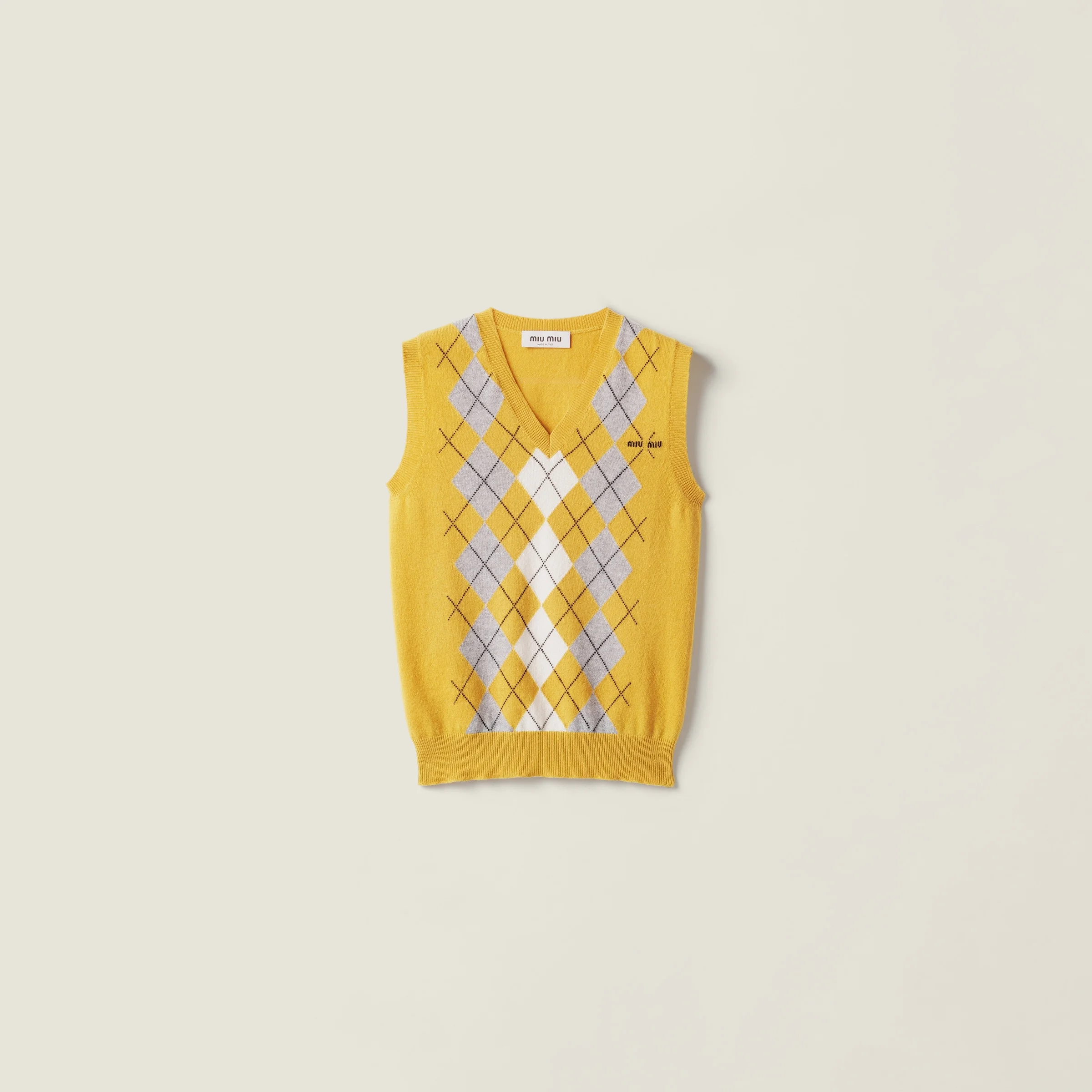 The argyle motif adds playful sophistication to the fine craftsmanship of this soft cashmere vest, reinterpreting a classic piece according to Miu Miu's refined and contemporary vision. - Product code: MMV296_174B_F0010_S_OOO - Argyle intarsia knit - Regular fit - Sleeveless - V-neck - Semi-raglan shoulder - Ribbed hem - Intarsia logo - Imported - The model is 176 cm tall and wears a size 38 Height 58cm Materials Main material: 100% Cashmere