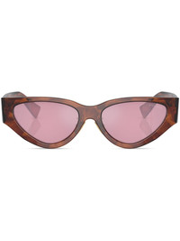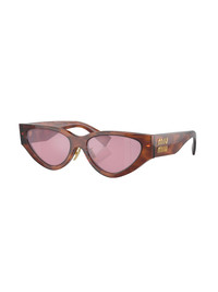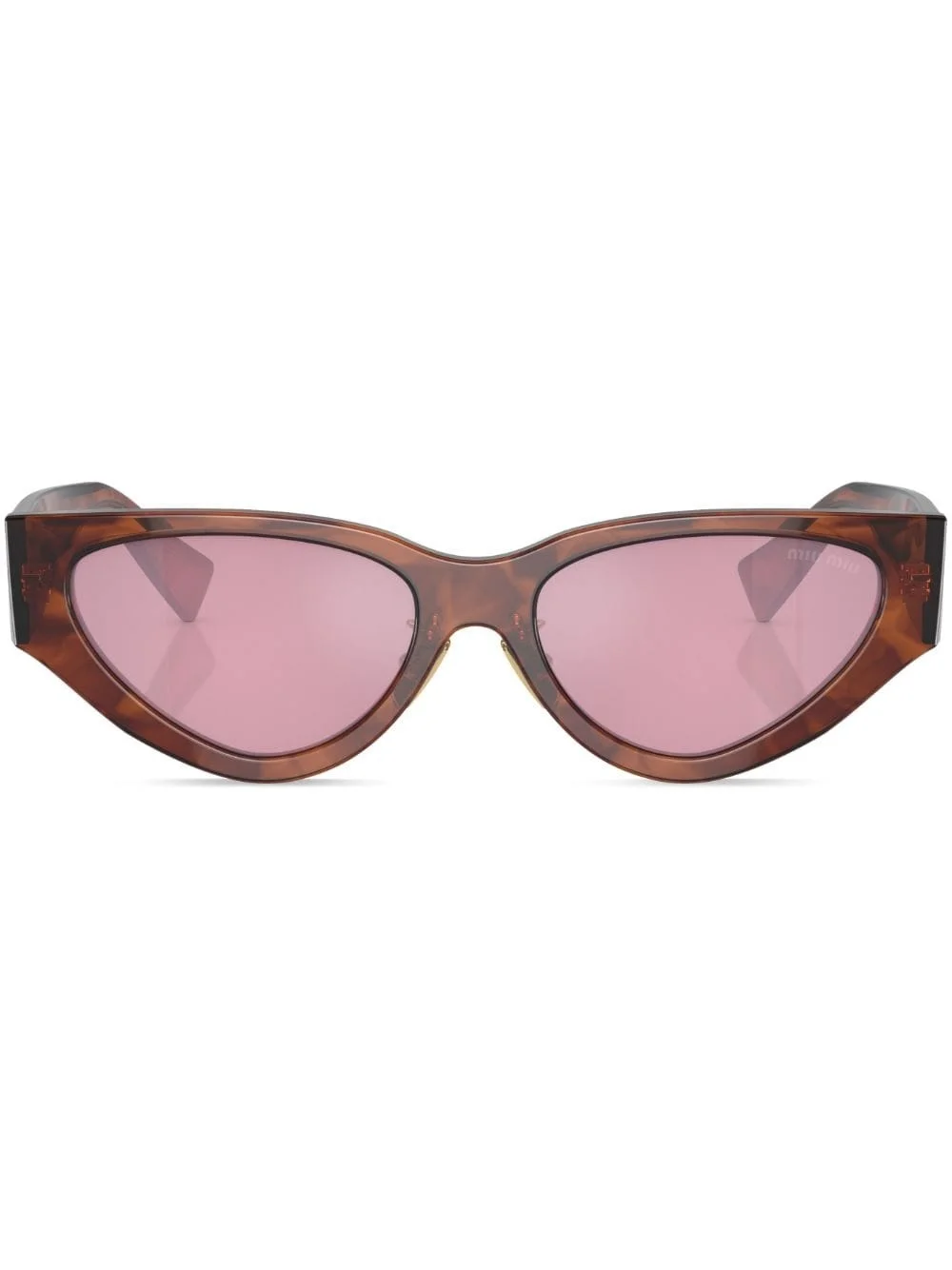 cat-eye frame sunglasses Miu Miu Eyewear captures their whimsical spirit through these cat-eye sunglasses. Enhanced with a timeless tortoiseshell effect, they boast pink lenses and a logo accent at the temples. Highlights - Tobacco brown - Cat-eye frame - Pink tinted lenses - Nose pads - Logo print at the arm - Straight arms - Curved tips - Tortoiseshell effect - These glasses come with a protective case. Composition Acetate 100%