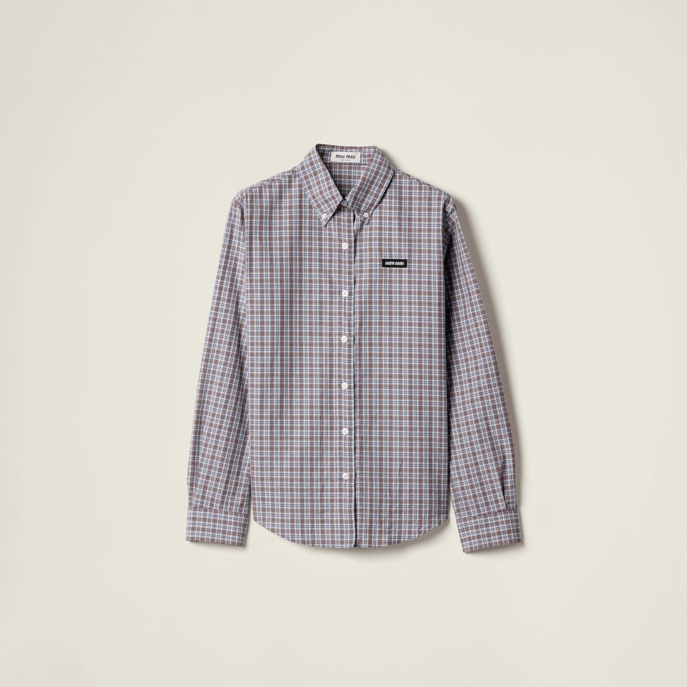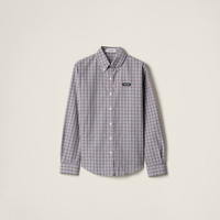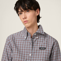 The classic button-down style of this poplin shirt becomes unique thanks to the check pattern that plays with menswear style codes and reflects Miu Miu's essence, creating looks characterized by iconic contrasts. - Product code: MK1920_17LX_F0OBD_S_OOO - Straight Fit - Shirt collar - Rounded hem - Front button closure - Long sleeves with buttons - Knit logo label - Imported Height 70cm Materials Main material: 100% Cotton