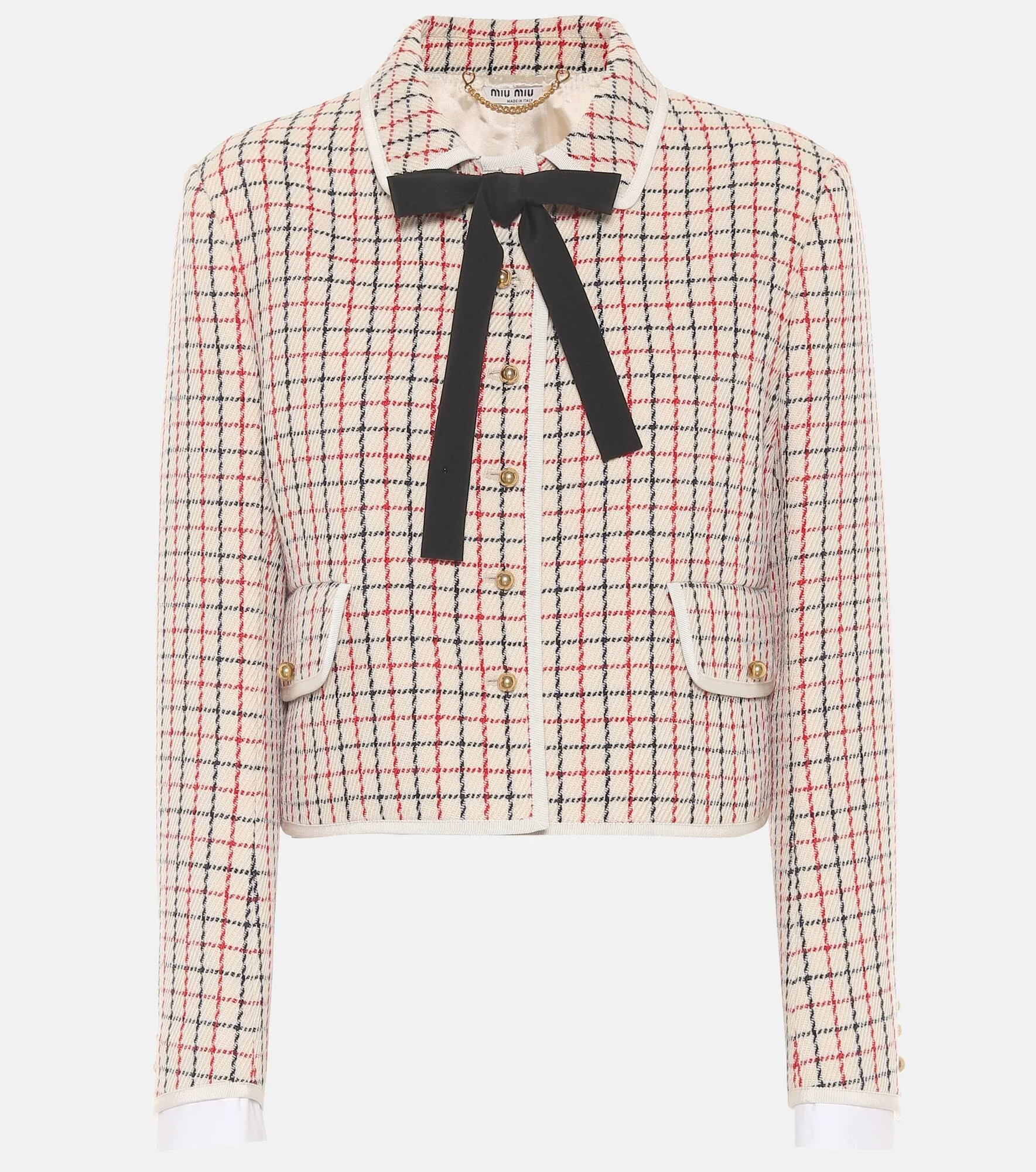 From its bow fastening to its rounded collar, this beige jacket speaks the language of Miu Miu. Made in Italy from virgin wool with full viscose lining, the checked design is neatly cropped and features white piping for a touch of polish. Pair yours with the matching miniskirt to capture the spirit of the brand. Product Details - Made in Italy - Material: 100% virgin wool - Pockets: buttoned pockets, flap pockets - Designer color name: Avorio+Rosso - Closure: snap-buttoned fastenings, buttoned front - Lining: 100% viscose, fully lined - Care instructions: dry clean - Item number: P00497577 Size & Fit - True to size - Designed for a loose fit - Slightly cropped - The model seen in the picture is 178cm-5'10" and wearing a size IT 40