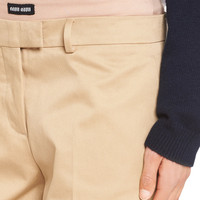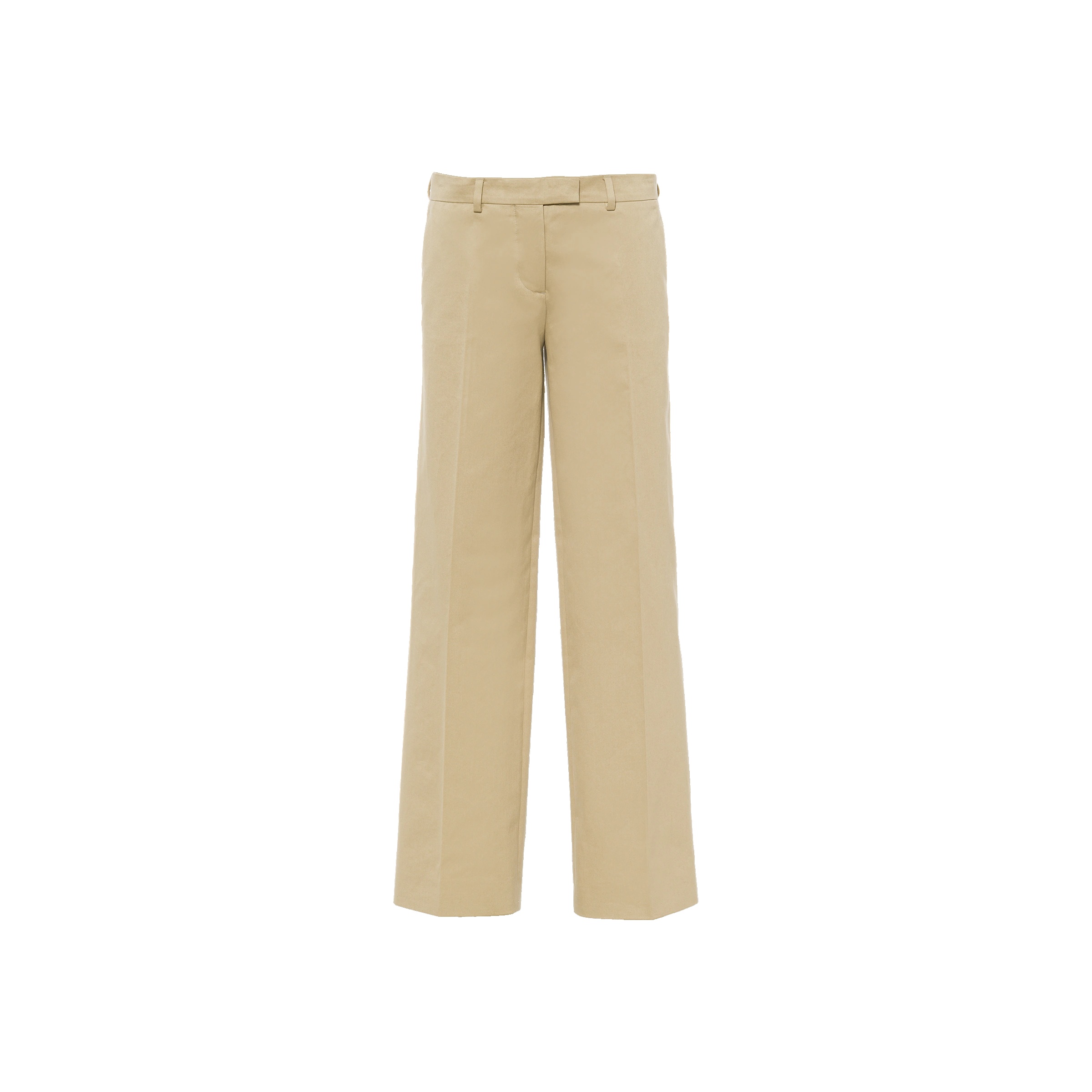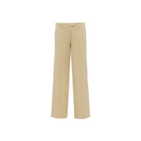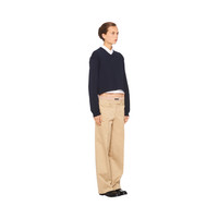 Miu Miu presents an exercise in references and a study of reality, using what exists to create something new. The classic silhouette of chino pants is subverted, creating an ironic layered effect in which the iconic lettering logo stands out. The waist is low-rise and proportions take on new meanings. - Straight fit - Unlined garment - Zipper fly with hook - Embroidered logo - Angled slash pockets - Back welt pockets Height 107 cm The model is 180 cm tall and wears a size 38 Product code MP1578_1UPX_F0065
