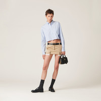 Irreverent, distinctive and unconventional femininity teams up with an everyday utility mood and refined details. In the new chino skirt, the miniskirt silhouette is paired with front and back pockets with button and deliberately visible lining. The embroidered logo on the back is the perfect finishing touch for an aesthetic in total Miu Miu style. - Product code: MG1939_1UPX_F0065_S_231 - Mini-skirt - Front button closure - Embroidered logo - Patch pocket - Visible pocket lining - Imported - The model is 177 cm tall and wears a size 38 Height 26cm Materials Main material: 100% Cotton
