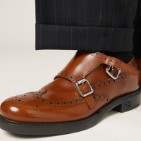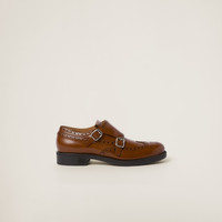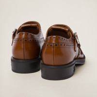 The iconic contradiction between masculine and feminine and between classic and modern becomes a harmonious dialog between two aesthetically different worlds. Church's X Miu Miu Double Monk Brogue shoes have an iconic design and finely crafted artisan finishes paired with Miu Miu's rebellious soul to create an original look that encourages unconventional combinations untethered from classic style. The tonal Miu Miu logo stands out on the tongue and heel, adding its signature touch to this collaboration. Finally, the rubber sole ensures that the shoe is light and flexible for a comfortable fit. - Product code: 5E039E_055_F0005_F_M030 - Upper with decorative broguing - Leather lining - Embossed logo on the tongue - Full-brogue double monk strap with logo-engraved metal buckles - Rubber sole - Rubber heel with metal lettering logo - Heel height: 30 mm - Leather insole - Imported
