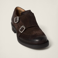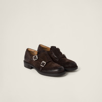 The iconic contradiction between masculinity and femininity and between classic and modern becomes a harmonious dialog between two aesthetically different worlds. Church's X Miu Miu double monk strap brogues have an iconic design with artisanal finishes combined with Miu Miu's rebellious soul to create a new look that invites original combinations not bound to conventional codes. The tonal Miu Miu logo stands out on the tongue and heel to adds its signature touch to this collaboration. The rubber sole ensures a comfortable fit and makes the shoe light and flexible. - Product code: 5E039E_0B2_F0003_F_M030 - Upper with wingtip perforations - Leather lining - Embossed logo on tongue - Double monk strap with logo-engraved metal buckles - Rubber sole - Rubber heel with metal lettering logo - Heel height 30 mm - Leather insole - Imported