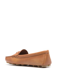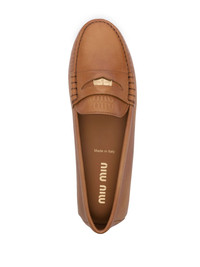 coin-detail leather loafers Miu Miu puts its stamp on the classic loafer silhouette in this pair, embossing its logo on the tongue and engraving it on the coin that features in the traditional penny slot. Highlights - Brown - Calf leather - Smooth grain - Coin detailing - Penny slot - Embossed logo to the front - Logo at the sole - Round toe - Branded leather insole - Star-shaped segmented rubber sole - Slip-on style Composition Sole: Rubber 100%, Calf Leather 100% Lining: Calf Leather 100% Outer: Calf Leather 100% SIZE & FIT Measurement HEEL 0.39 in(1 cm)