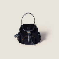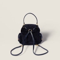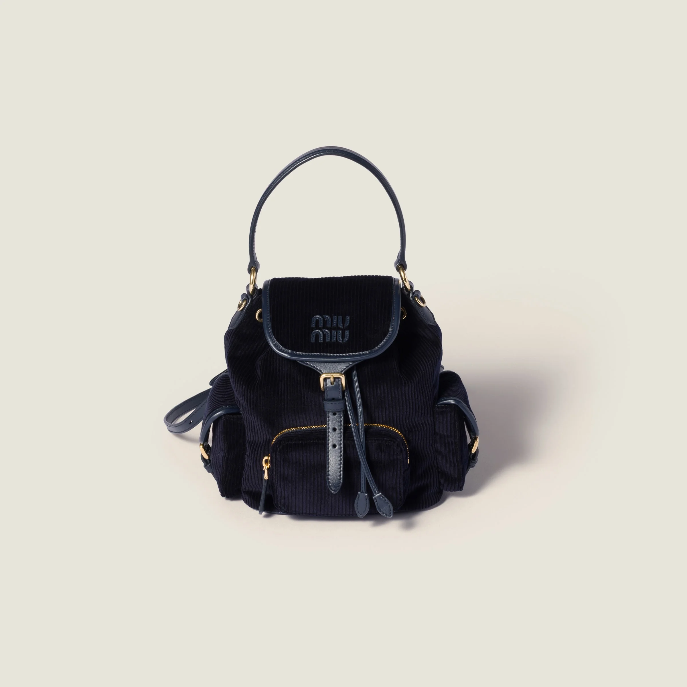 Vintage references and elegant contemporary functionality define the style of this Miu Miu backpack, enhanced with a multi-pocket design, leather trim, and the refined texture of corduroy. - Product code: 5BZ043_AF81_F0124_V_OOM - Leather handle - Front zipper pocket - Side flap pockets - Gold-tone hardware - Flap closure with strap and buckle - Fabric interior with patch pocket - Leather lettering logo on the flap - Imported Height 22cm Width 18cm Length 11.5cm Materials Main material: Cotton