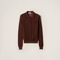 Inspired by the polo shirt, a symbol of the Miu Miu uniform, this cardigan is characterized by the fascinating lacy texture that adds a touch of airy femininity to a typical menswear silhouette. - Product code: MMF970_17NL_F0324_S_OOO - Ribbed knit/lacy motif - Slim-fit silhouette - Long sleeves - Ribbed knit crew neck - Semi-raglan shoulder - Front button closure - Ribbed knit cuffs and hem - Intarsia logo - Imported - The model is 178 cm tall and wears a size 38 Height 58cm Materials Main material: 100% Cotton