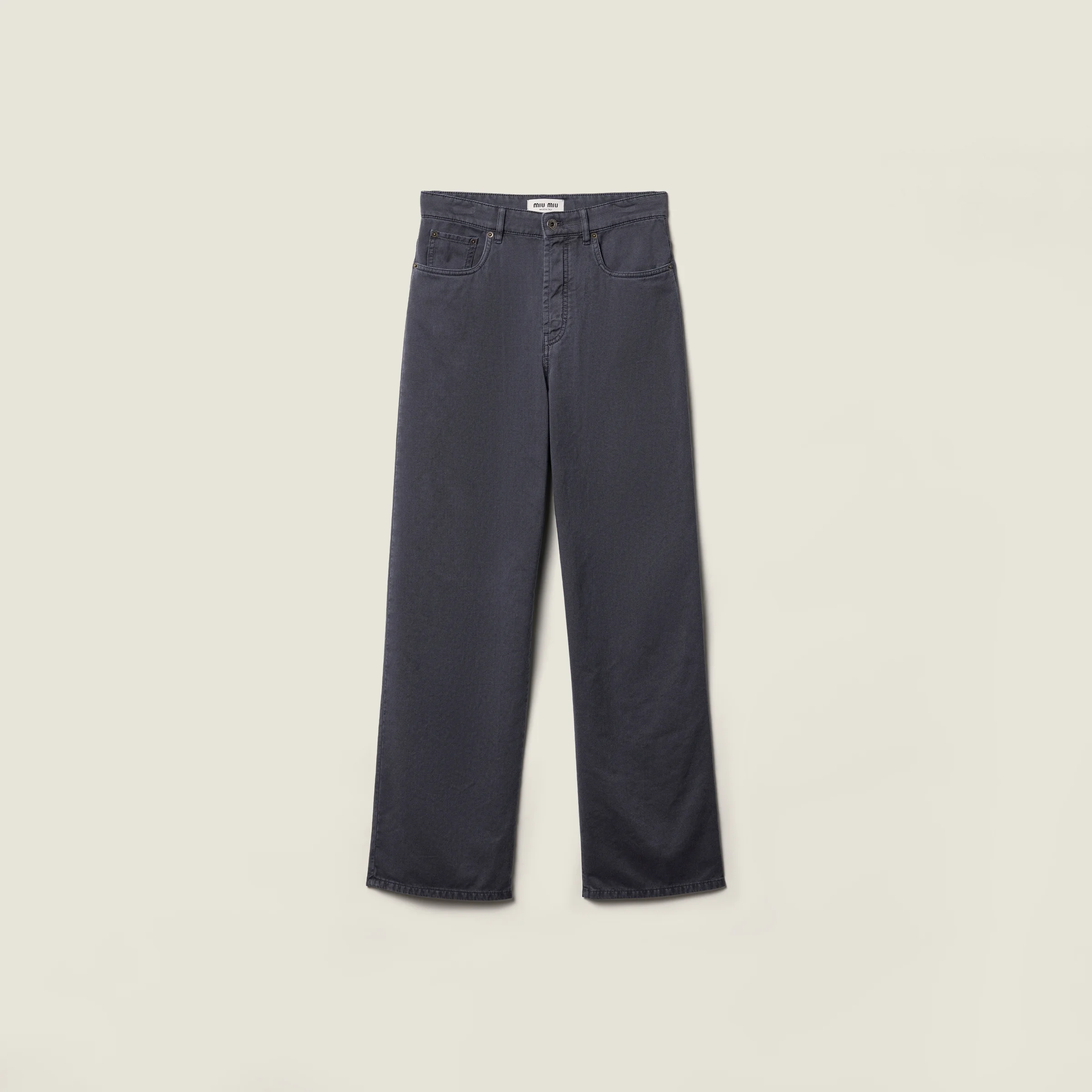 These sleek and fluid denim pants stand out for the lightness of the structure that recalls classic menswear styles and reinterprets the aesthetic through a casual essence and garment-dyed process. - Product code: GWP394_17AE_F0170_S_232 - Garment dyed treatment - Relaxed fit - Mid-rise waist - Hem width: 27 cm, Size: 25 - Zipper fly with button - Matching stitching - Rounded front pockets - Patch pockets on the back - Total length: 113 cm, size 25 - Ironed pleat from hip to hem - Embroidered logo - Imported - The model is 177 cm tall and wears a size 38 Height 112cm Materials Main material: 100% Cotton