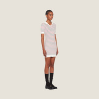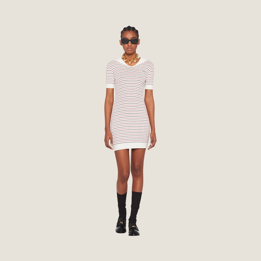 Lightweight fabrics allude to nautical clothing, reinterpreted through the magnifying glass of fashion: the sailor collar and a practical mood mix with typically feminine details. - Product code: MMA738_11FK_F0009 - Short sleeves - Cable knit and ribbed knit - Straight fit - Sailor collar -- Regular shoulder - Ribbed knit hem and sleeve trim - Knit logo patch - Height: 84cm - Imported