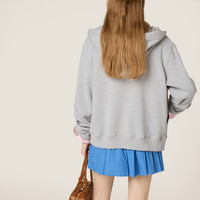 The iconic Miu Miu wardrobe finds a new seasonal interpretation in the relaxed fit of this cotton fleece zipper hoodie with intarsia logo that enriches versatile looks with a lifestyle spirit. - Product code: MJL085_17JV_F0031_S_OOO - Oversized fit - Unlined garment - Long sleeves with ribbed knit cuffs - Front zipper closure - Straight ribbed knit hem - Angled slash pockets - Intarsia logo - Imported - The model is 180 cm tall and wears a size 38 Materials Main material: 100% Cotton