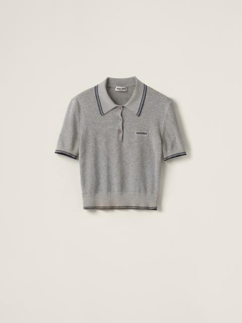 A college style is combined with Miu Miu's distinctive character in this cotton knit polo shirt. The boxy lines and ribbed knit trim define a refined design while the intarsia logo completes the garment with an iconic note. - Product code: MML956_15BL_F03UI_S_OOO - Short sleeves - Boxy fit - Semi-raglan shoulder - Ribbed knit sleeve trim and hem - Front button closure - Imported - The model is 180 cm tall and wears a size 38