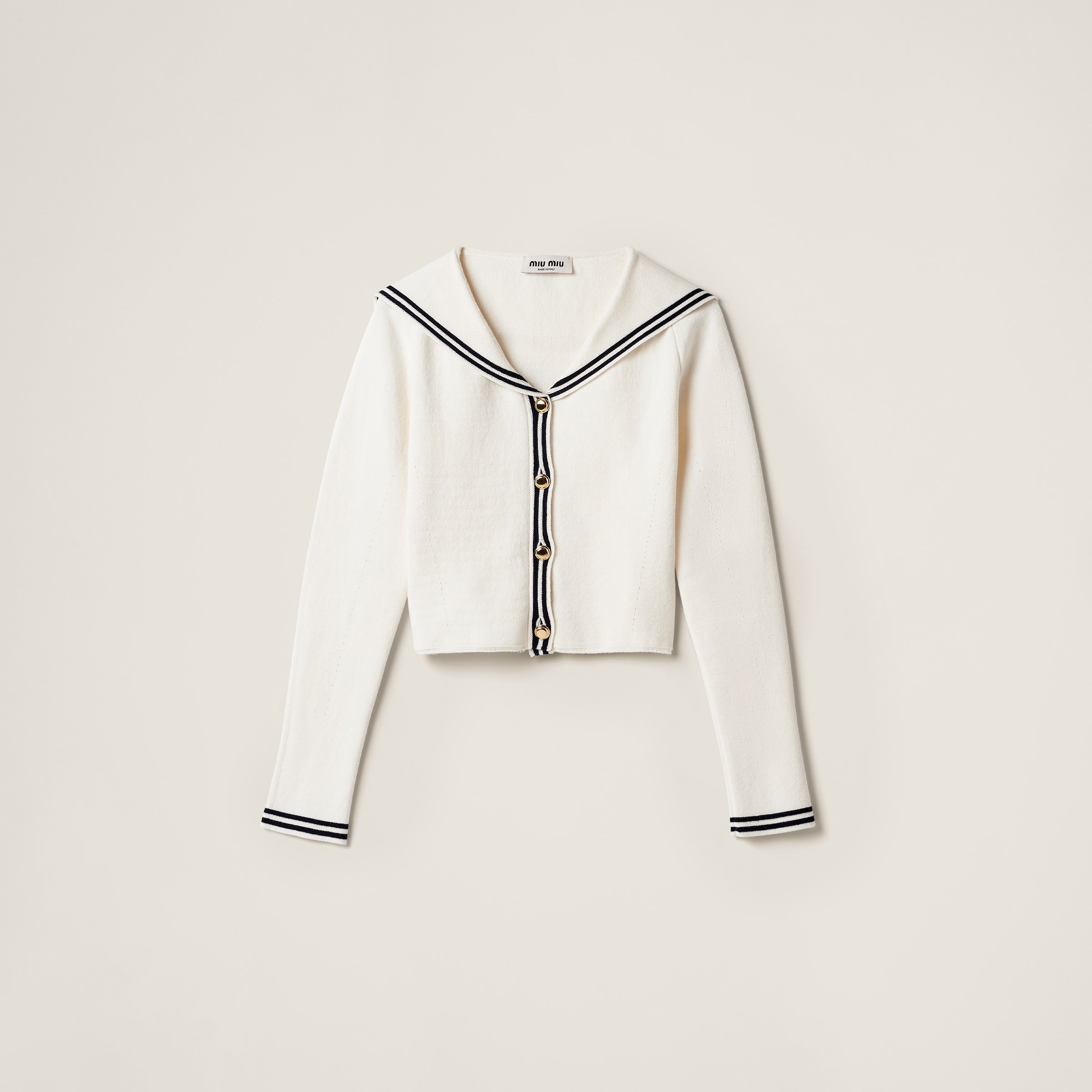 Nautical inspirations and refined details characterize this cotton knit cardigan. The slim lines are combined with the wide sailor collar while the embroidered logo completes the design with an iconic note. - Product code: MMF860_14GX_F0UB0_S_OOO - Long sleeves - Plain knit - Slim fit - Sailor style collar - Regular shoulder - Embroidered logo - Front button closure - Imported - The model is 178 cm tall and wears a size 38 Height 45cm
