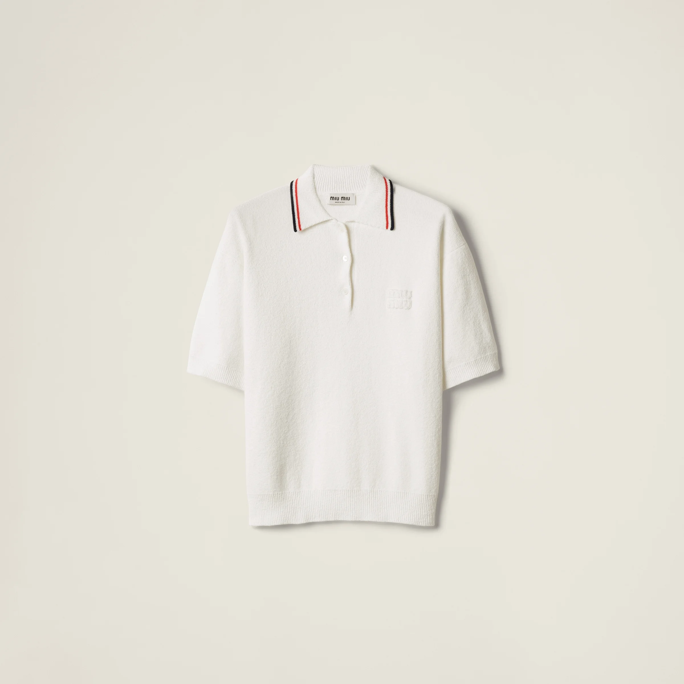 The double stripe detail recalls a men's sportswear aesthetic made casual by the relaxed fit of this polo shirt enriched with the refined cotton boucle texture. - Product code: MMLB31_17NR_F0009_S_OOO - Sponge knit - Menswear fit - Ribbed knit collar - Short sleeves - Semi-raglan shoulder - Ribbed knit cuffs and hem - Front button closure - Embroidered logo - Imported - The model is 178 cm tall and wears a size 38 Height 59cm Materials Main material: 65% Cotton 35% Recycled Polyamide