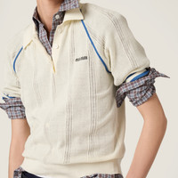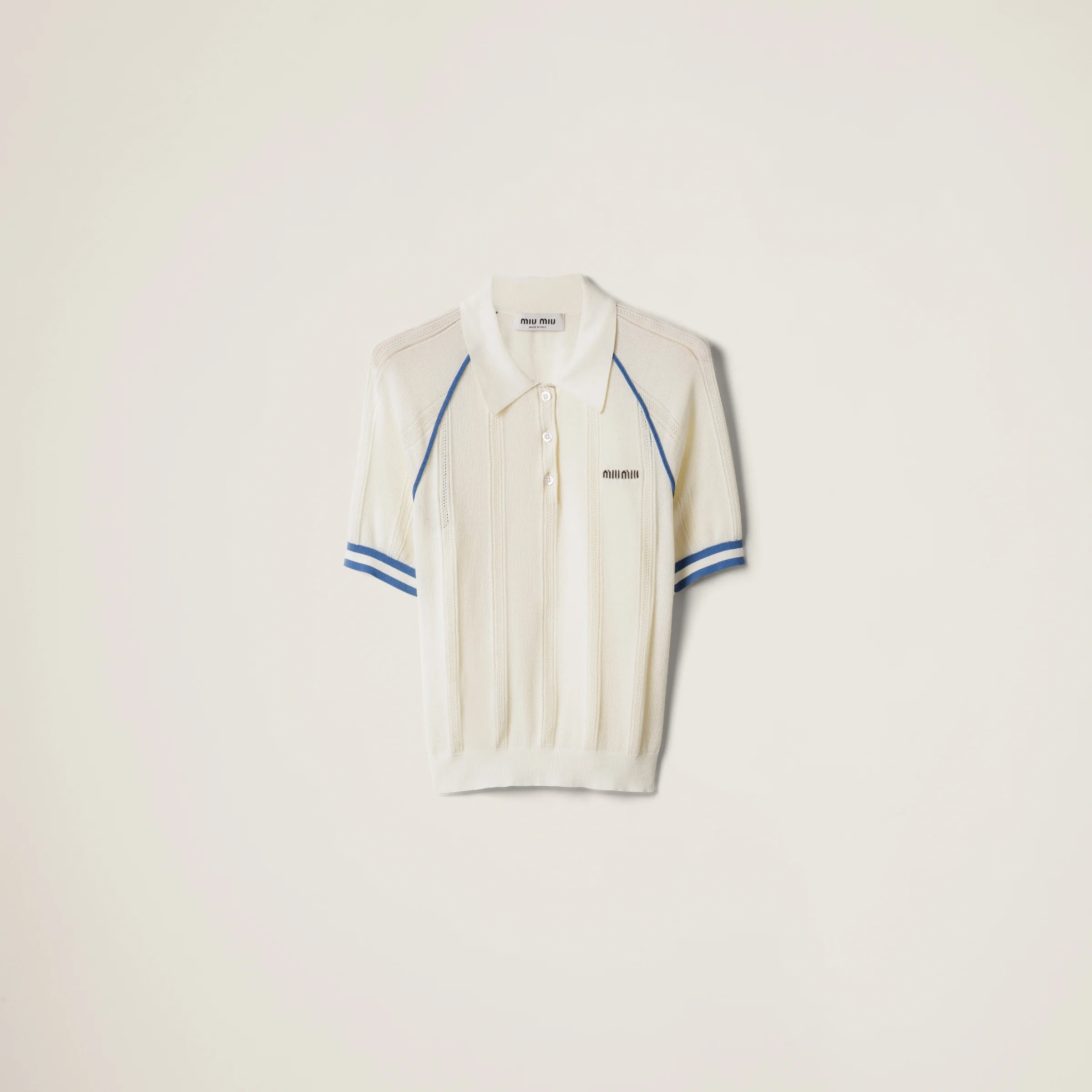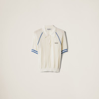 Sporty details meet the femininity of lacy openwork that characterizes this cotton knit polo shirt and stylishly reinterprets Miu Miu's experimental codes. - Product code: MMLB39_17N2_F0O0M_S_OOO - Openwork motif - Straight fit - Short sleeves - Ribbed knit collar - Semi-raglan shoulder - Ribbed knit sleeve trim and hem - Front button closure - Intarsia logo - Imported Height 56cm Materials Main material: 100% Cotton