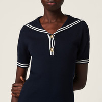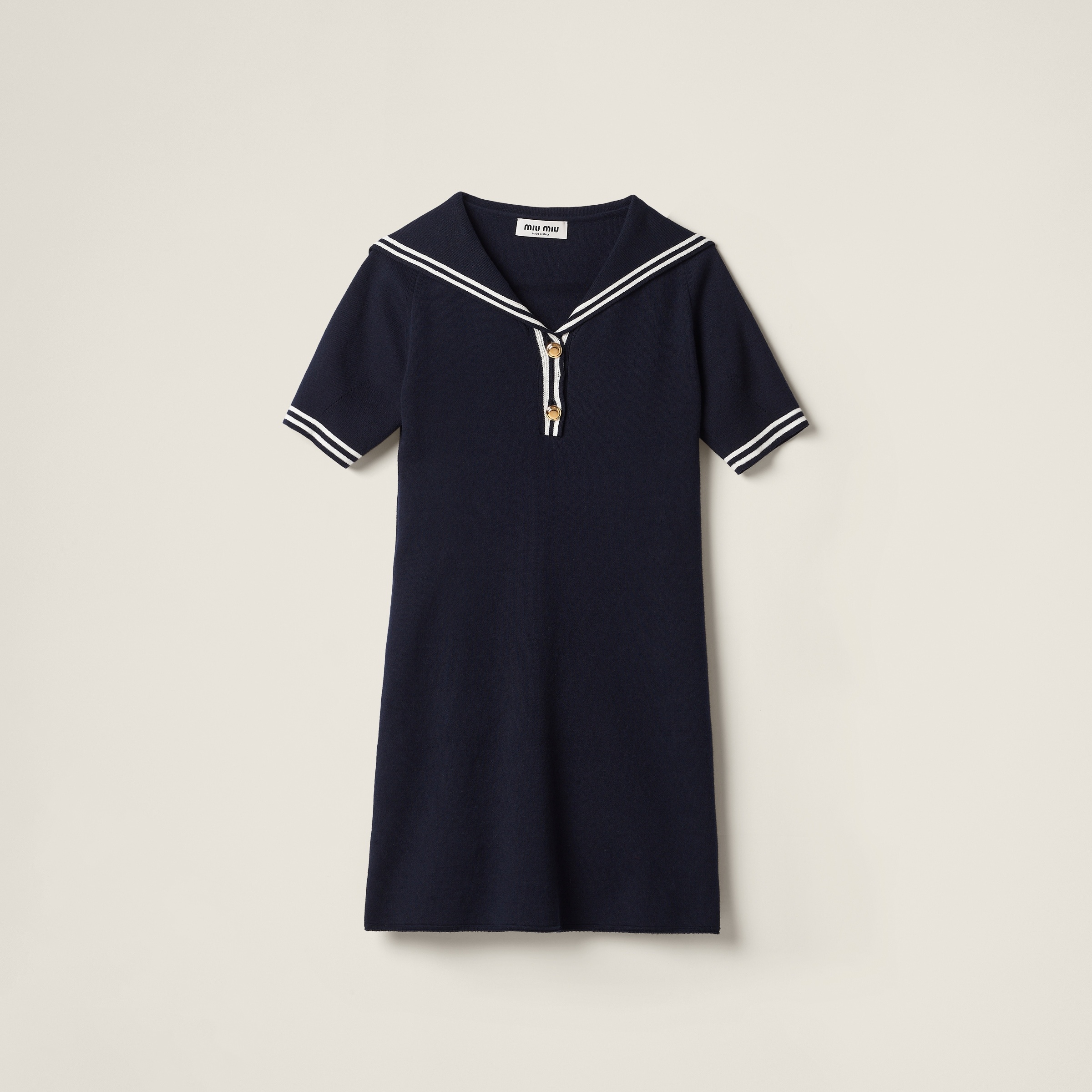 A bold, refined style characterizes this cotton mini-dress. The double stripe trimming the sailor collar and sleeves echoes the color of the embroidered logo that completes the design with an iconic note. - Product code: MMA859_14GX_F022X_S_OOO - Short sleeve - Plain knit - Mini-dress silhouette - Sailor collar - Regular shoulder - Embroidered logo - Front button closure - Imported - The model is 179 cm tall and wears a size 38