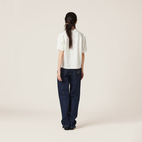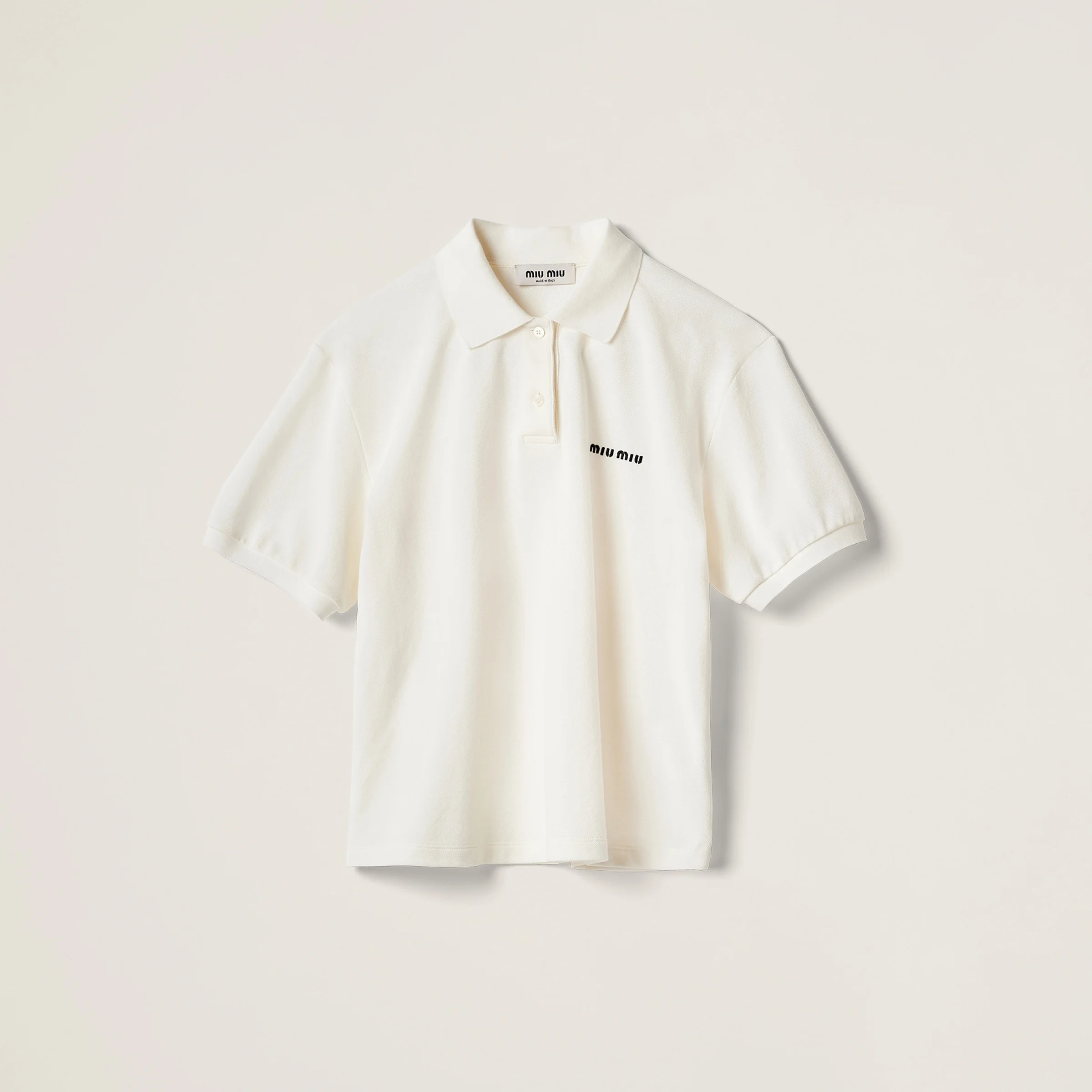 The casual style of the polo shirt meets Miu Miu's distinctive character in this cotton pique polo shirt. The embroidered logo completes the design. - Product code: MJN535_14RW_F0009_S_OOO - Boxy fit - Polo-style collar - Front button closure - Short sleeves - Embroidered logo - Long slits on the sides - Twin needle hem - Imported - The model is 176 cm tall and wears a size 38 Height 58cm Materials Main material: 100% Cotton