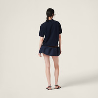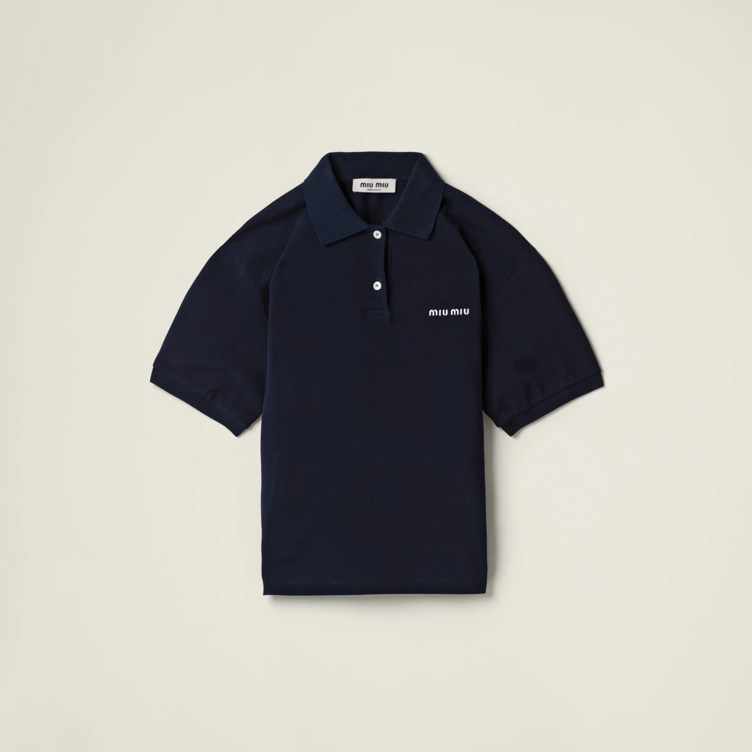 The casual style of the polo shirt meets Miu Miu's distinctive character in this cotton pique polo shirt. The embroidered logo completes the design. - Product code: MJN535_14RW_F0008_S_OOO - Boxy fit - Polo-style collar - Front button closure - Short sleeves - Embroidered logo - Long slits on the sides - Twin needle hem - Imported - The model is 180 cm tall and wears a size 38 Height 58cm Materials Main material: 100% Cotton