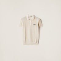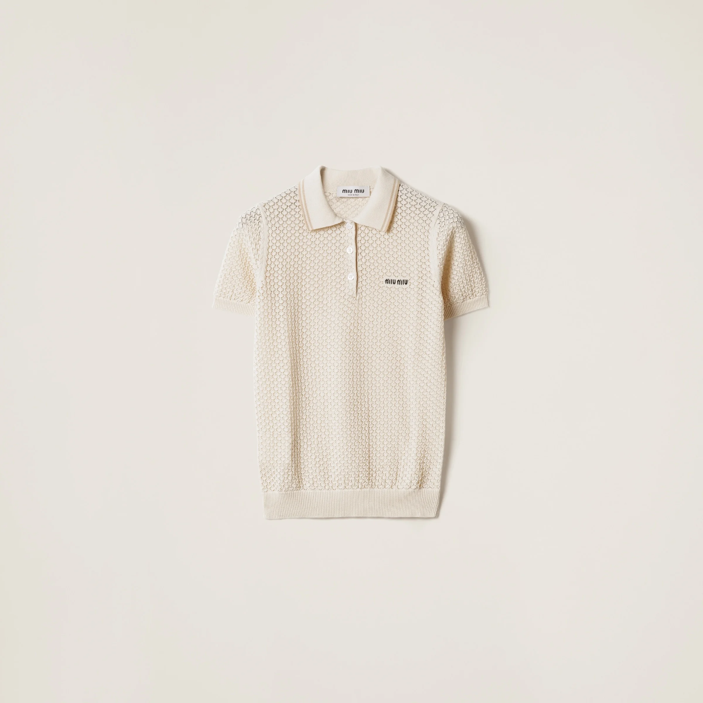 Inspired by a symbol of Miu Miu style, this polo shirt is characterized by the fascinating lacy texture that adds a touch of airy femininity to a typical menswear silhouette. - Product code: MMLB28_17NL_F0018_S_OOO - Ribbed knit/lacy motif - Straight fit - Short sleeves - Ribbed knit collar - Semi-raglan shoulder - Ribbed knit sleeve trim and hem - Front button closure - Intarsia logo - Imported - The model is 180 cm tall and wears a size 38 Height 58cm Materials Main material: 100% Cotton