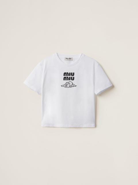 The embroidered Miu Miu logo enriches the sleek lines of this cotton jersey tee thanks to its distinctive, iconic touch. - Product code: MJN483_14ER_F0009_S_WMO - Slim fit--Crew-neck - Short sleeve - Embroidered logo - Twin-needle hem - Imported - The model is 176 cm tall and wears a size 38 Height 49cm Materials Main material: 100% Cotton