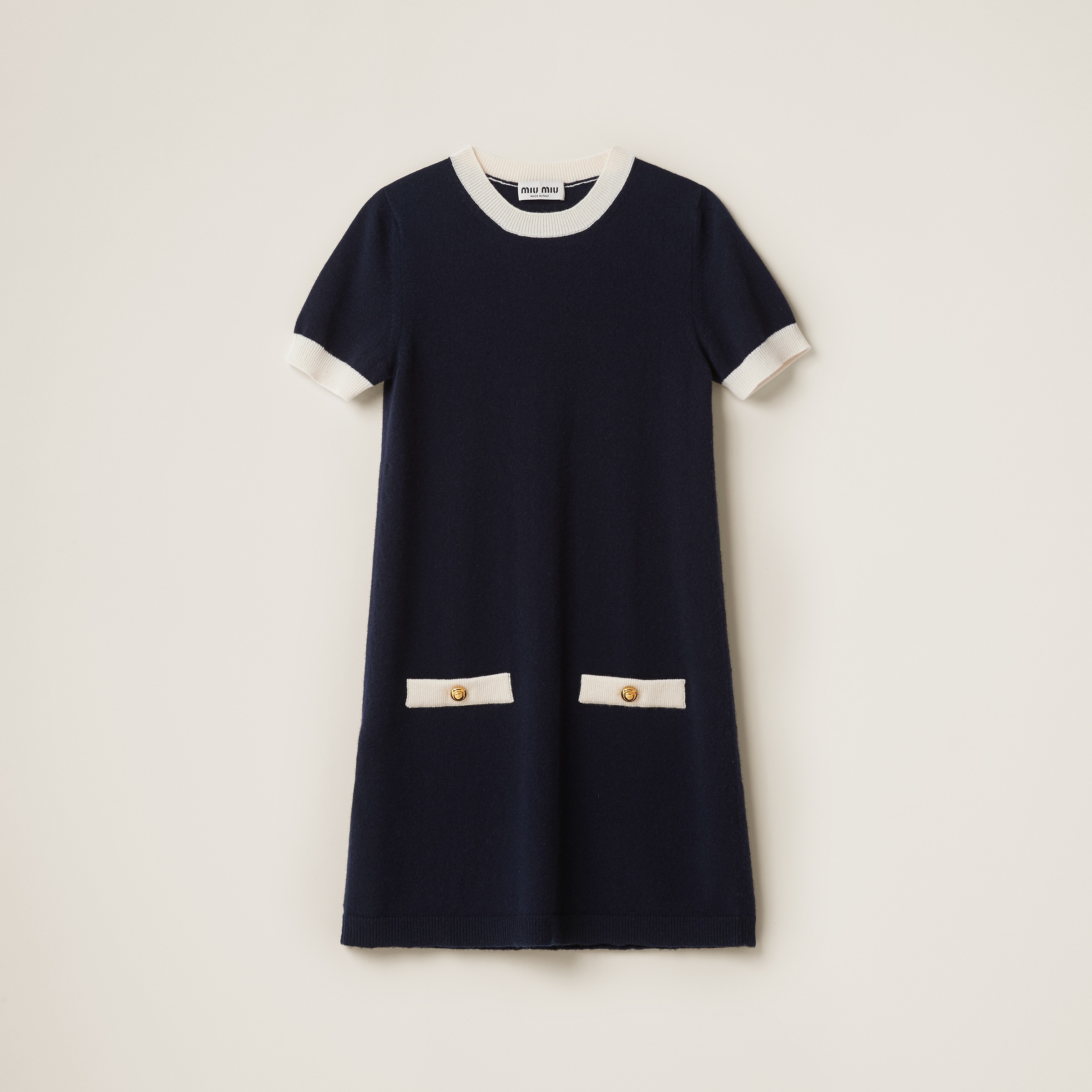 A rigorous design comes to life in vintage-inspired details. The crew neck, sleeve trim and pockets in a contrasting color accent the silhouette of this mini-dress made of fine cashmere with romantic allure. - Product code: MMA761_12KG_F0008_S_231 - Short sleeves - Plain knit - Straight fit - Ribbed crew neck - Regular shoulder - Ribbed knit sleeve trim and hem - Knit logo patch - Front pockets - Imported - The model is 178 cm tall and wears a size 38 - Height: 80cm