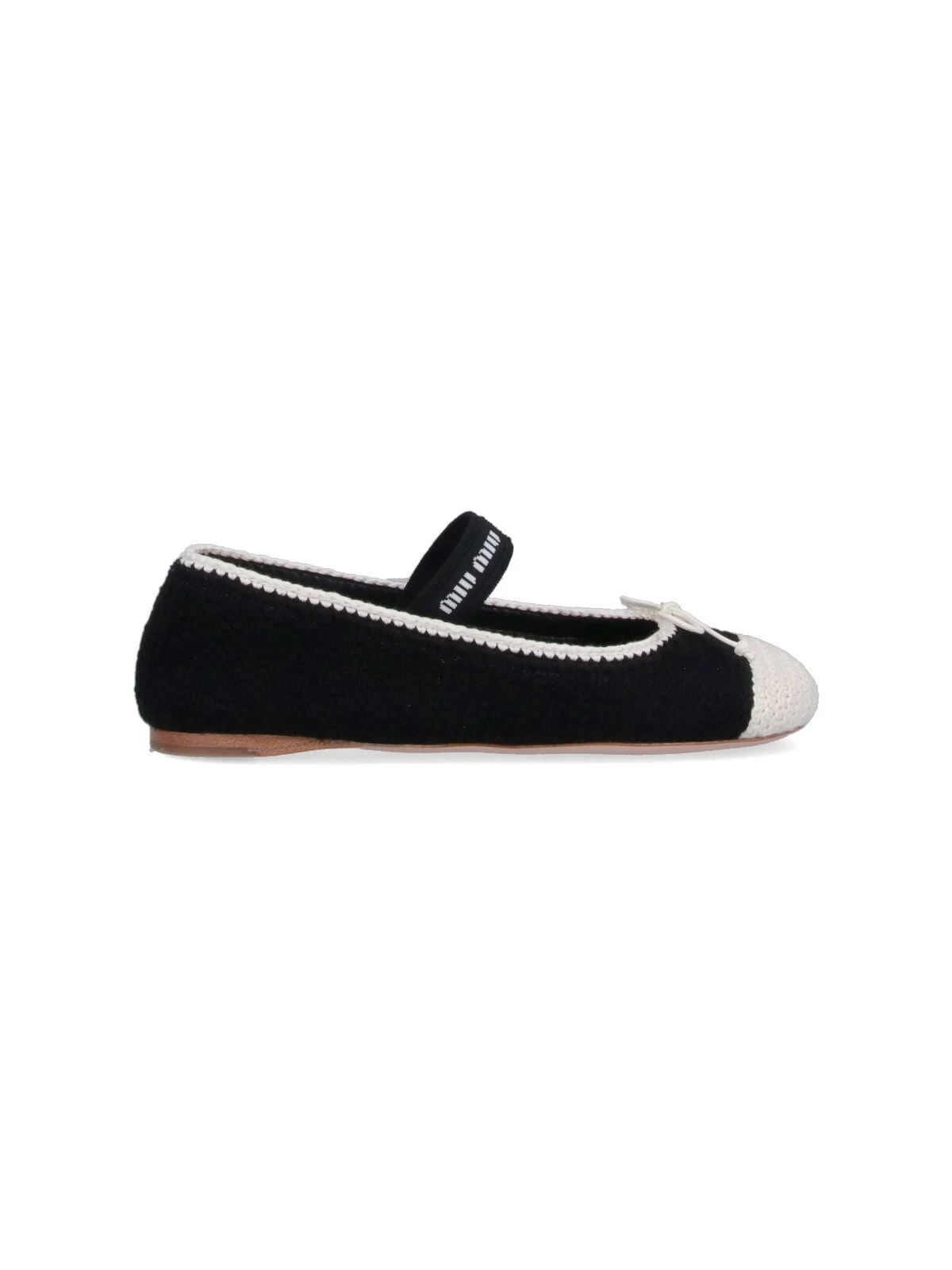MIU MIU CROCHET KNIT BALLET FLATS IN BLACK COTTON WITH CONTRAST TRIM, ROUND TOE, TOP LEATHER BOW DETAIL, UPPER ELASTIC BAND, CONTRAST LOGO DETAIL, LEATHER SOLE. PRODUCT INFO PRODUCT CODE 5F138E 005 2CQ2F057Z COMPOSITION: 100% COTTON MADE IN: ITALY - TRIMS: 100% LEATHER - SOLE: 100% LEATHER.
