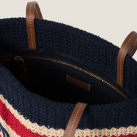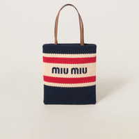 Miu Miu reimagines the classic tote bag in a crochet version. A lively colorful pattern covers the bag, giving it an edgy touch. The embroidered logo gives the accessory an iconic and immediately recognizable style. - Product code: 5BG248_2DO3_F075R_V_ORO - Leather handles - Gold-tone hardware - Embroidered logo--Drill lining with zipper pocket - Imported Height 41cm Width 32cm Materials Main material: Cotton Polyester Viscose