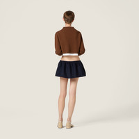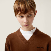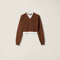 Simple jersey inserts are combined with fine cashmere knit to create a layered effect that defines Miu Miu looks with cropped proportions and a strong contrast between details and materials. - Product code: MMLB76_174K_F0046_S_OOO - Plain knit - Cropped fit - Long sleeves - V-neck - Semi-raglan shoulder - Ribbed knit cuffs and hem - Cotton jersey inserts on the neck, cuffs and hem - Intarsia logo - Imported - The model is 178 cm tall and wears a size 38 Height 40cm Materials Main material: 100% Cashmere