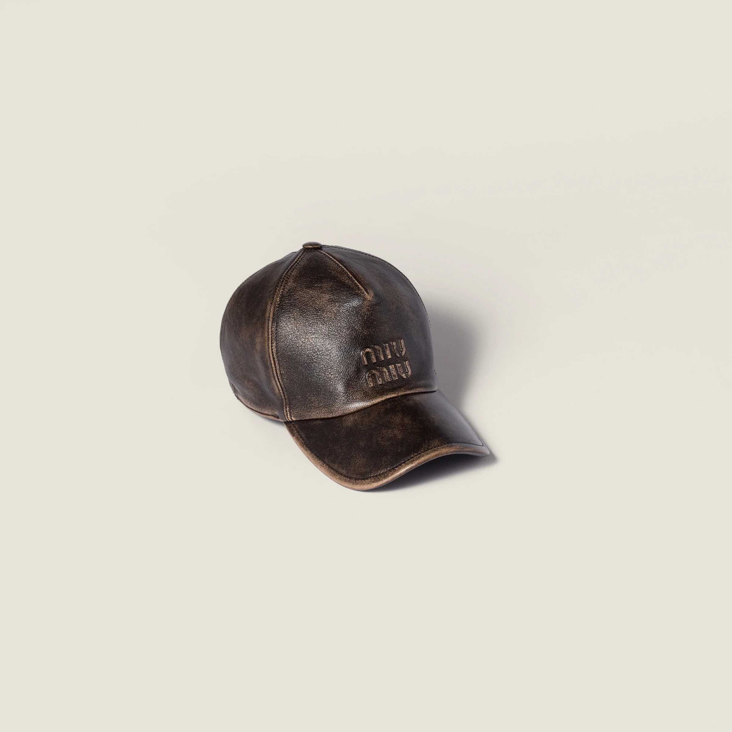 The refined vintage effect treatment of the nappa leather reinterprets Miu Miu's sporty codes, enhancing the aged texture of this baseball cap that combines vintage references with the iconic embossed logo. - Product code: 5HC179_AF6P_F0201 - Vintage effect treatment - Cotton gabardine lining - Adjustable leather back strap - Embossed lettering logo - Imported Materials Main material: Lambskin
