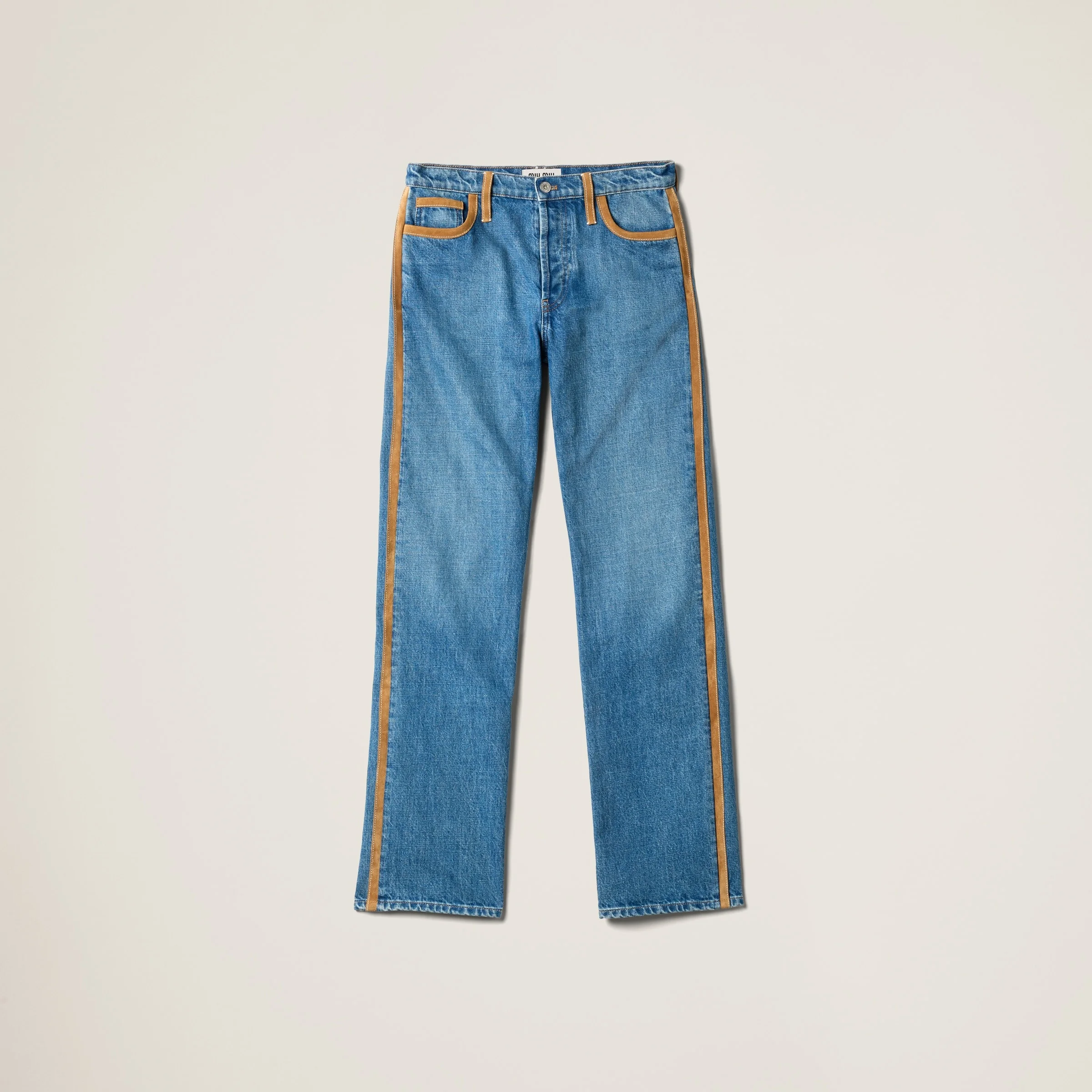 Miu Miu's iconic denim expresses its vintage essence and defines the style of these regular fit jeans enriched with suede details that reveal contemporary, artisanal allure. - Product code: GWP566_17GI_F0013_S_OOO - Washed denim treatment - Regular fit - Regular waist - Button fly - Contrasting top-stitching - Front rounded pockets with coin pocket - Back patch pocket - Total length: 108 cm, Size: 25 - Hem width: 22 cm, Size: 25 - Embroidered logo - Imported - The model is 178 cm tall and wears a size 38 Height 110cm Materials Main material: 100% Cotton