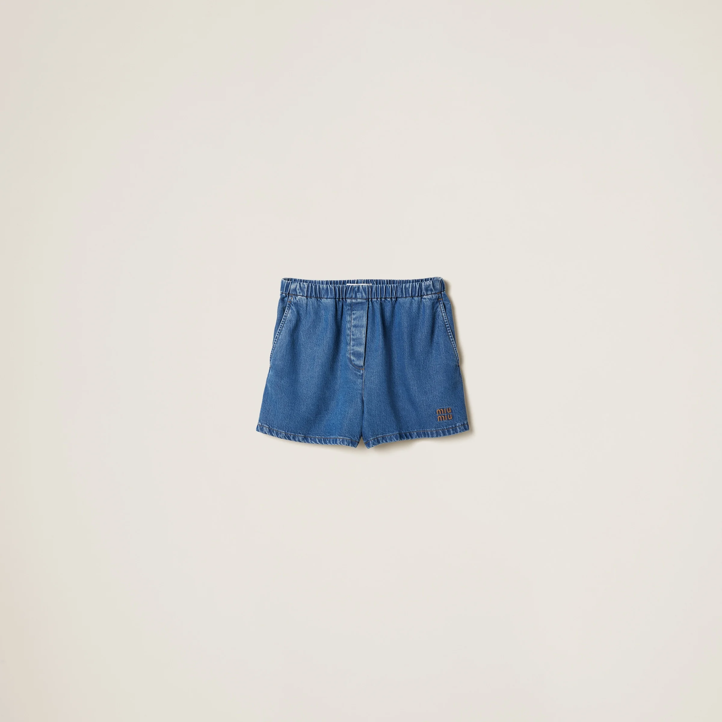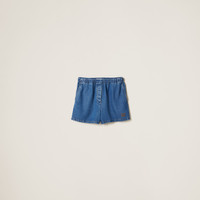 The iconic and distinctive Miu Miu logo stands out on the sleek lines of these denim Bermudas. - Product code: GWP523_143V_F0008_S_OOO - Washed treatment - Menswear fit - Regular waist - Contrasting stitching - Angled front slash pockets - Ironed crease - Embroidered logo - Imported - The model is 178 cm tall and wears a size 38 Height 32cm Materials Main material: 100% Lyocell