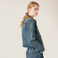 Denim, a distinctive fabric of the Miu Miu wardrobe, is enriched with details for this slim-fit blouson jacket. The velvet collar and raw-cut hem express versatile modernity. - Product code: GWB235_1567_F0008_S_OOO - Slim fit - Washed treatment - Velvet collar - Long sleeves, one-button cuffs - Button closure - Unlined garment - Contrasting stitching - High pockets with flaps and buttons - Low welt pockets - Length from center back 47 cm. size 38 - Raw cut hem - Embroidered logo - Imported - The model is 179 cm tall and wears a size 38 Height 47cm Materials Main material: 100% Cotton