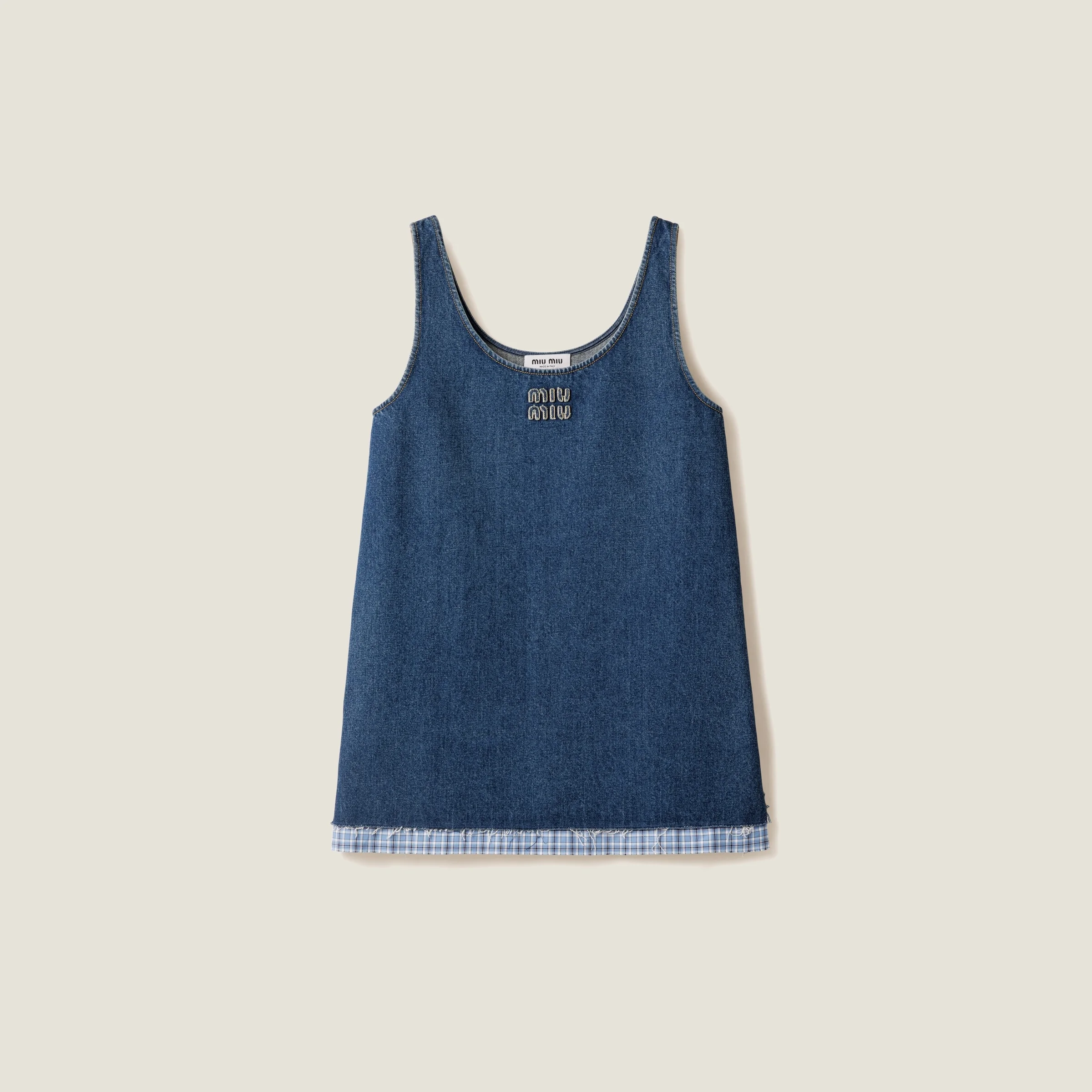 The distinctive poplin check and raw-cut hem enrich the flared silhouette of this dress in washed denim, an emblematic element of the Miu Miu uniform. - Product code: GWA219_1568_F0008_S_OOO - Flared fit - Washed treatment - Lined garment - Scoop neck - Sleeveless - Contrasting stitching - Straight hem - Center-back length: 82 cm, size: 38 - Embroidered logo - Imported Height 83cm Materials Main material: 100% Cotton