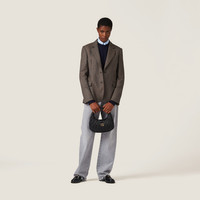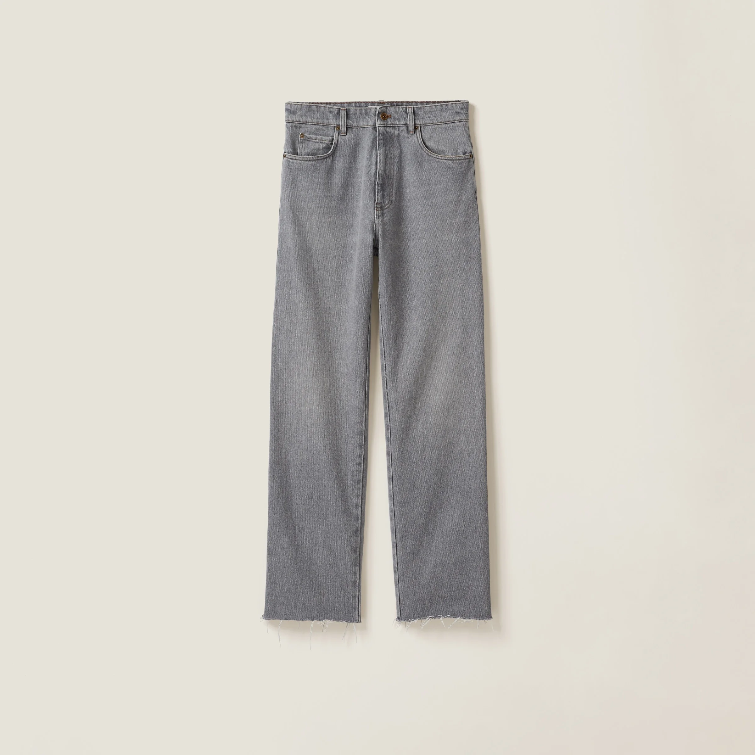 The timeless character of denim meets Miu Miu's bold style in these pants. Relaxed lines define an effortless look while the embroidered logo stands out with an iconic note on one of the back pockets. - Product code: GWP483_13LF_F0031_S_232 - Washed denim - Zipper fly with button - Relaxed fit - Regular waist - Contrasting top-stitching - Rounded front pockets - Back patch pockets - Ironed crease - Embroidered logo - Imported - The model is 179 cm tall and wears a size 38 Height 110cm Materials Main material: 100% Cotton