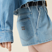 The washed denim treatment gives these denim shorts a slightly worn effect. The dart adds slight movement to the garment while the Miu Miu logo completes the look with an unexpected iconic note. - Product code: GWP477_131K_F0013_S_232 - Washed denim treatment - Regular fit - Low-rise waist - Hem width: 33 cm. Size: 25 - Zipper fly - Contrasting top-stitching - Angled front slash pocket - Patch pockets on the back - Ironed crease - Embroidered logo - Imported - The model is 180 cm tall and wears a size 38 Height 29cm Materials Main material: 100% Cotton