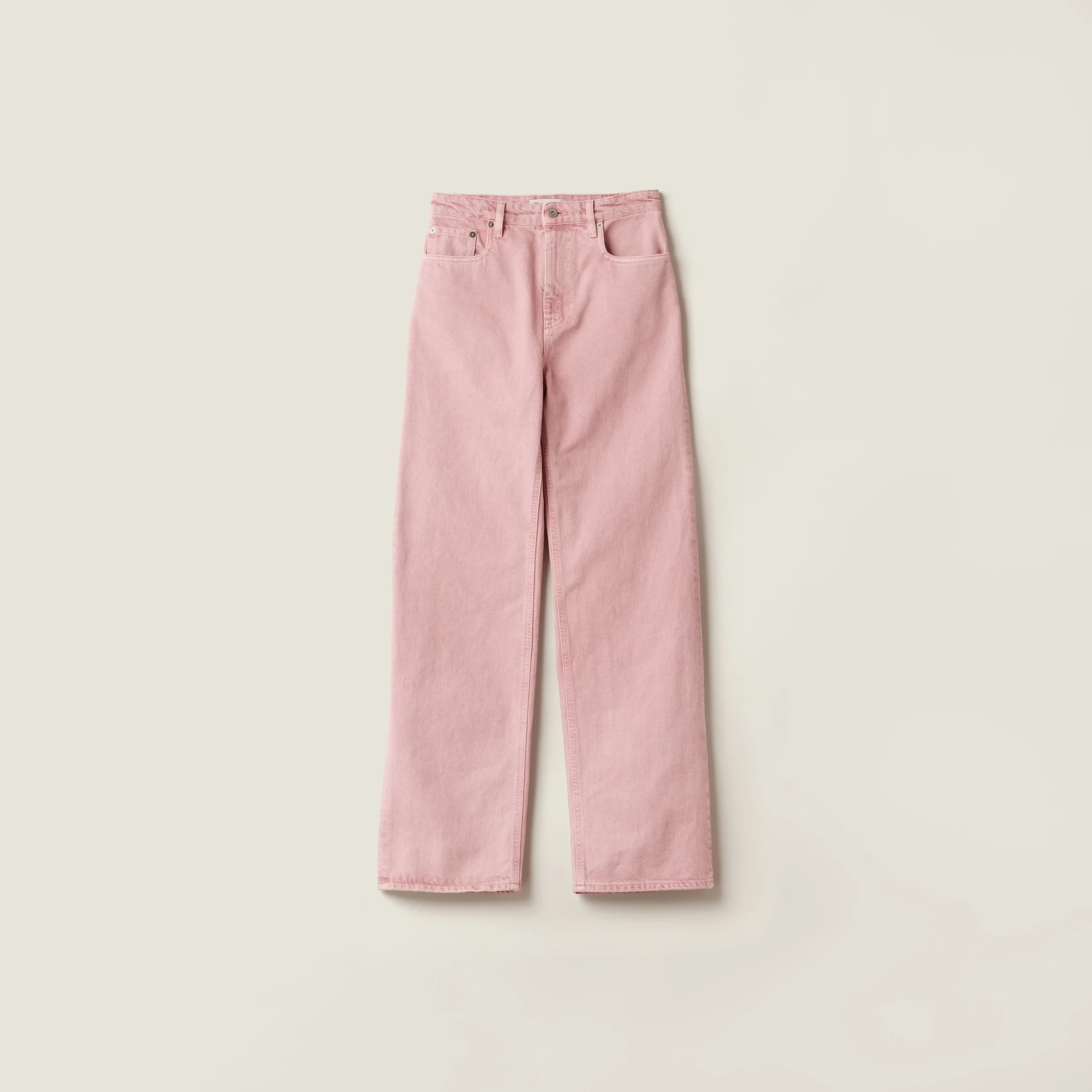 An intense wash and quality Japanese denim bring a rich, textured look to these high‑waisted trousers. Embroidered logo lettering and a gentle pink hue evoke a relaxed, true femininity central to Miu Miu’s aesthetic. - Product code: GWP588_179N_F0028_S_OOO - Washed and garment-dyed treatment - Straight fit - High waist - Zip and button closure - Tone-on-tone topstitching - Rounded front pockets with coin pocket - Patch pockets on the back - Total length: 112 cm, size 25 - Hem width: 21 cm, size 25 - Embroidered logo - Imported - The model is 178 cm tall and wears a size 38 Materials Main material: 100% Cotton