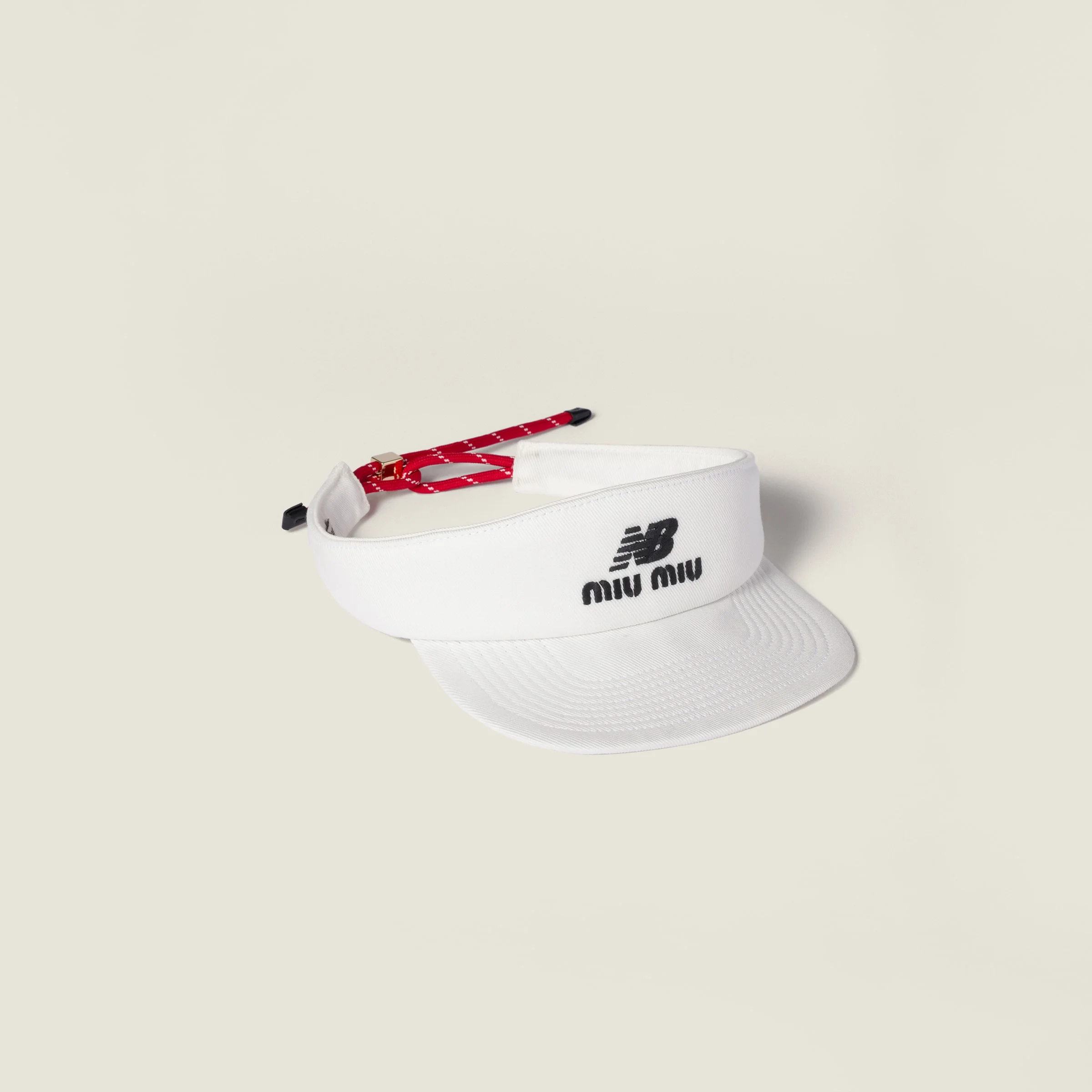 The New Balance X Miu Miu collection is inspired by sportswear, combining style and performance. Washed denim defines the contemporary character of this visor inspired by the tennis world and enriched with iconic symbols, like the two-tone cord and the embroidered logos in a contrasting color. - Product code: 5HV027_2IEY_F0970 - Washed treatment - Cord with sliding stopper - Embroidered logo - Imported Materials Main material: Cotton