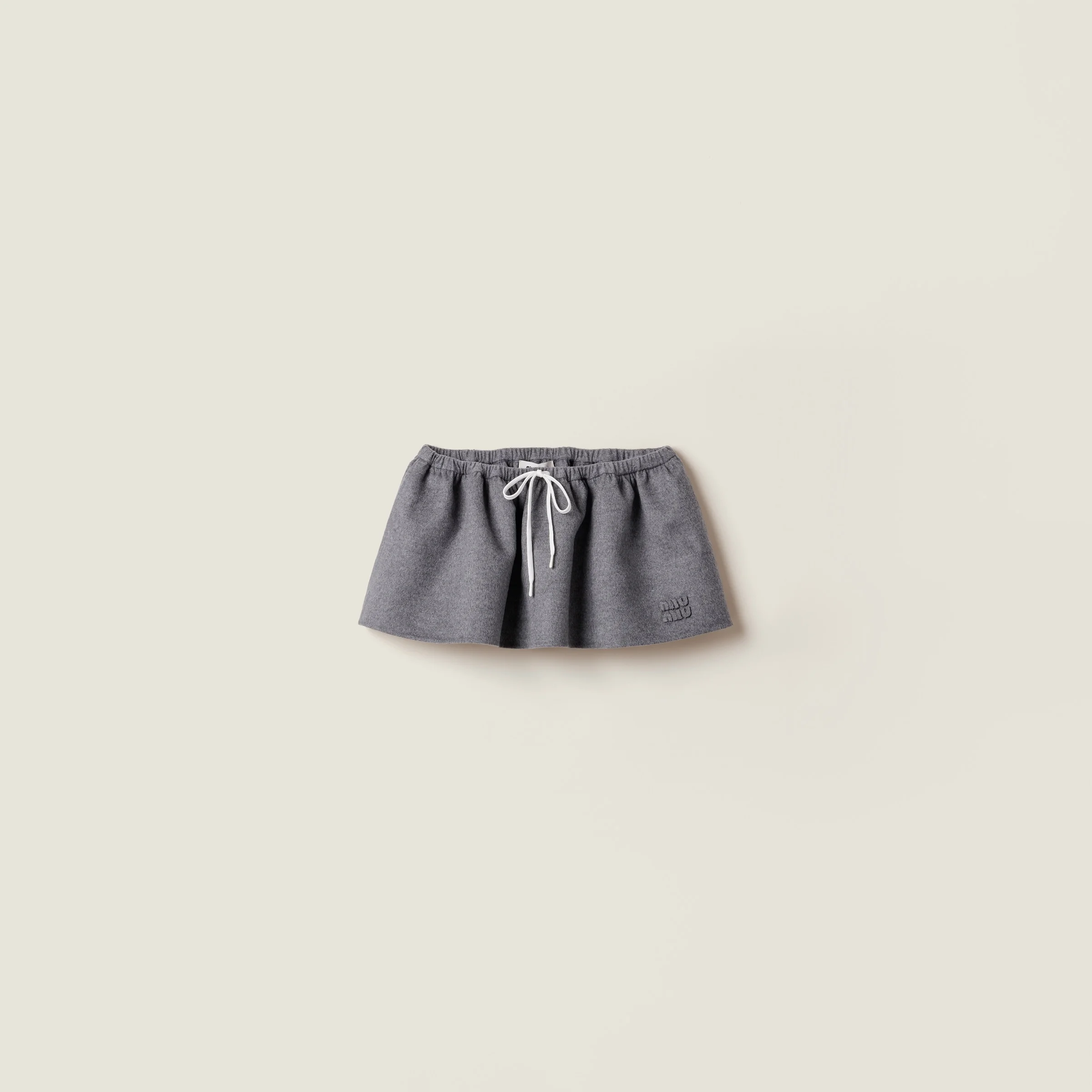 The sporty essence of the Miu Miu wardrobe is reinterpreted through classic fabrics. This double cashmere skirt stands out for its mini silhouette and soft line defined by the drawstring waist, an element of experimentation and contemporary versatility. - Product code: MG2252_15Q8_F0031_S_OOO - Flared fit - Front drawstring closure - Lettering logo - Imported - The model is 177 cm tall and wears a size 38 Height 27cm Materials Main material: 10% Cashmere 90% Virgin Wool