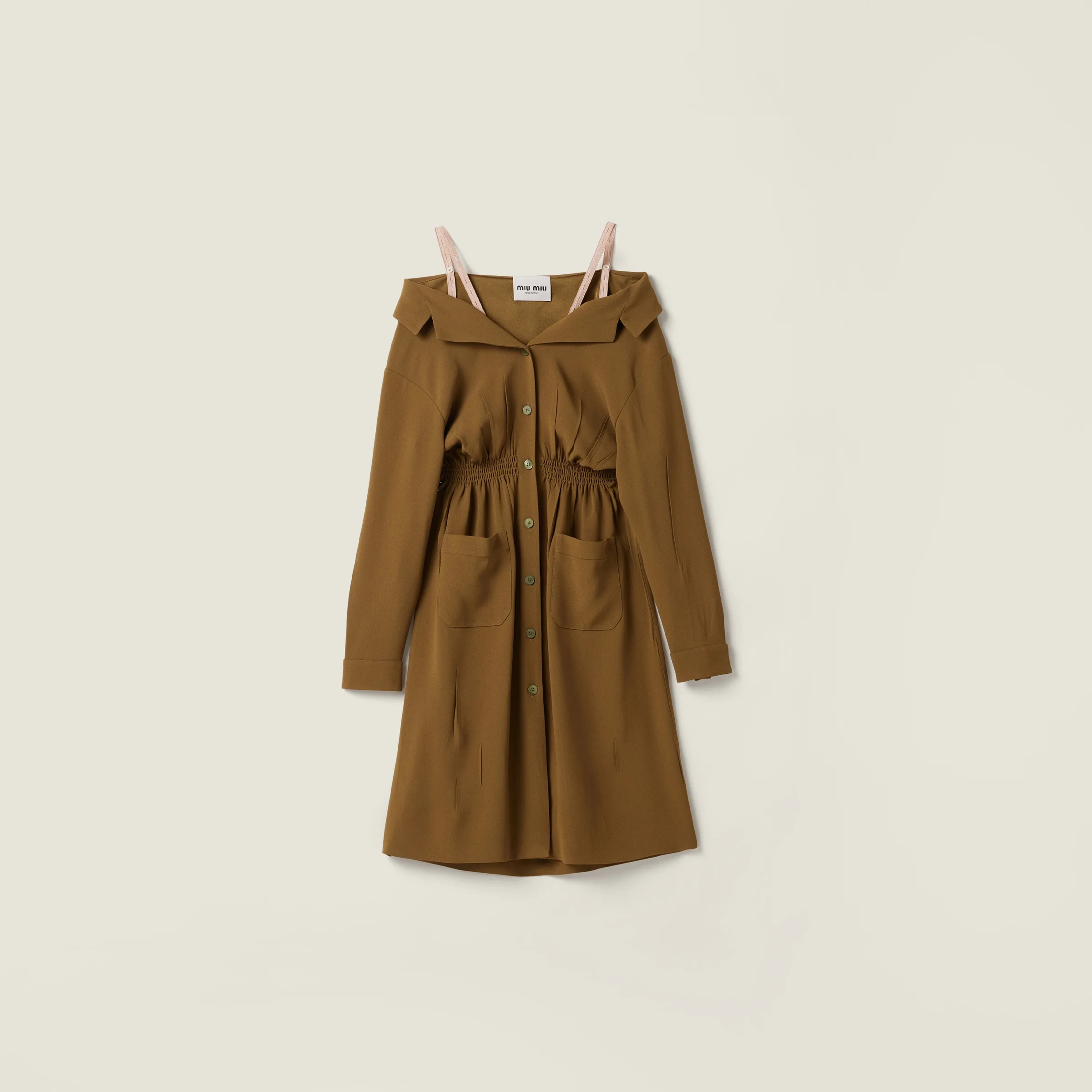 This silhouette reveals the body and plays with distinctive styling elements. This dress enriched by the fluid elegance of sable features simple shoulder straps and references to the shirt dress, interpreting Miu Miu's dialogue with authentic, ever-evolving femininity. - Product code: MF6052_16Z1_F0334_S_OOO - Flared fit - Wide neckline with shoulder straps - Front button closure - Long sleeves. - Knit logo label - Imported - The model is 177 cm tall and wears a size 38 Height 100cm Materials Main material: 74% Acetate 26% Viscose