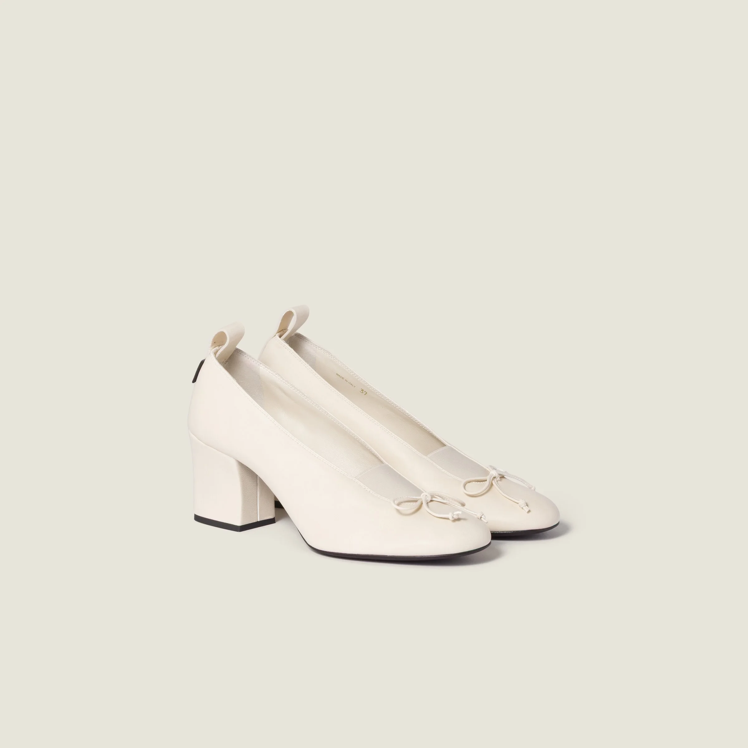 The delicate femininity of these pumps is reflected in the soft nappa leather that fits like a glove and creates a light, elegant silhouette. The bow and elastic gusset on the front express the meeting between style and functionality, distinctive codes of the Miu Miu wardrobe. - Product code: 5I551E_038_F0304_F_A065 - Leather-covered heel, height: 65 mm - Leather sole - Fabric logo label - Imported Materials Main material: Lambskin